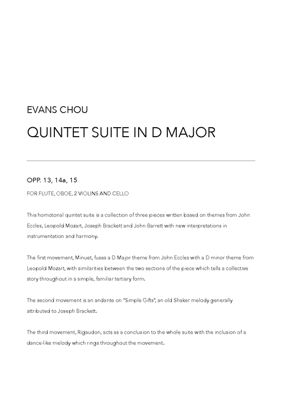 | Extra Information | This homotonal quintet suite is a collection of three pieces written based on themes from John Eccles, Leopold Mozart, Joseph Brackett and John Barrett with new interpretations in instrumentation and harmony. The first movement, Minuet, fuses a D Major theme from John Eccles with a D minor theme from Leopold Mozart, with similarities between the two sections of the piece which tells a collective story throughout in a simple, familiar tertiary form. The second movement is an andante on “Simple Gifts”, an old Shaker melody generally attributed to Joseph Brackett. The third movement, Rigaudon, acts as a conclusion to the whole suite with the inclusion of a dance-like melody which rings throughout the movement. |