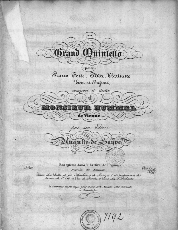Note by composer: "Ce quintetto avant été arrangé par l'auteur, pour les instruments à cordes, mais avec plusieurs changements de traits. Aucune partie d'instrument à Vent ne peut être remplacée par une d'instrument à cordes et vice versa." Fétis 1844 worklist indeed gives this as a quintet for piano and strings (published by Falter of Munich).