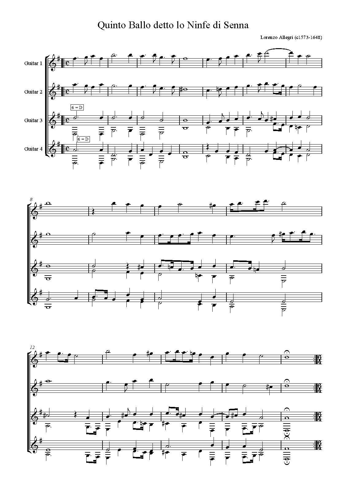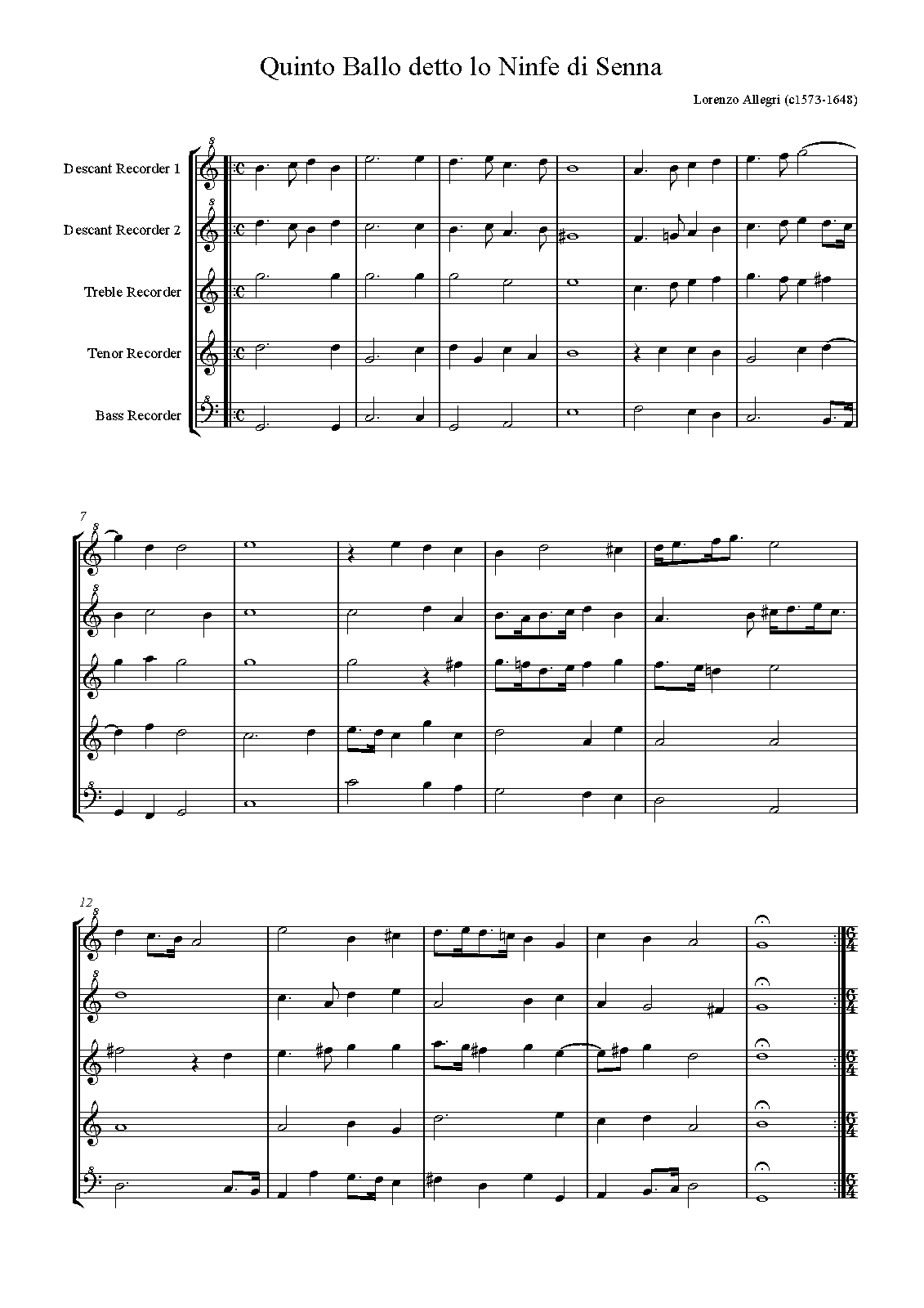 | Extra Information | According to Grove Music, "All of [Allegri's] dances can be identified as belonging to entertainments produced at the Medici court between 1608 and 1615, including La notte d'Amore (1608), La serena (1611, reworked as Le ninfe di Senna, 1613), Alta Maria (1614), I Campi Elisi (1614) and L'Iride (1615); each suite consists of dances from a single work." All 8 Ballets, used for Florentine stage works were published in Il Primo Libro delle Musiche, Venice 1618. |