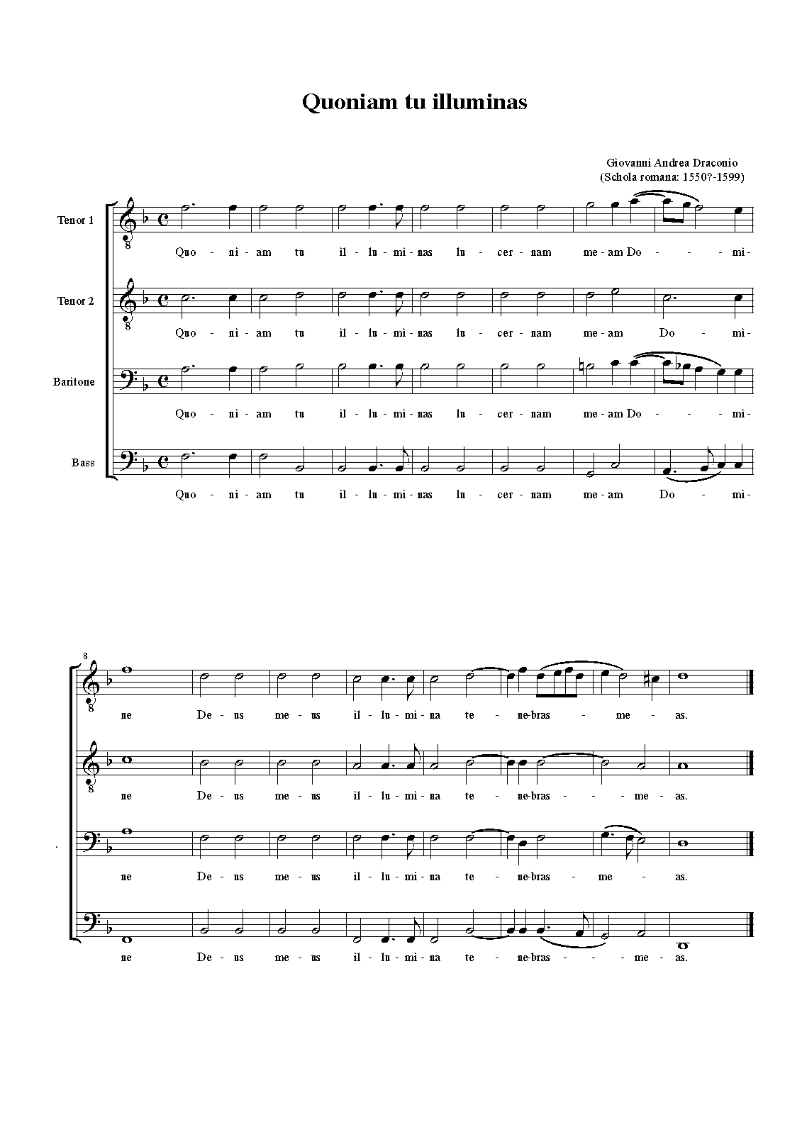 Source (or collection) is not listed, nor is this work in RISM. However, this is tagged as a motet, on the basis that according to Wikipedia, much of his sacred music was lost, but one volume of motets survives, which RISM lists as being for 5 voices. Tagging is subject to correction should this collection not contain Quoniam tu illuminas.
