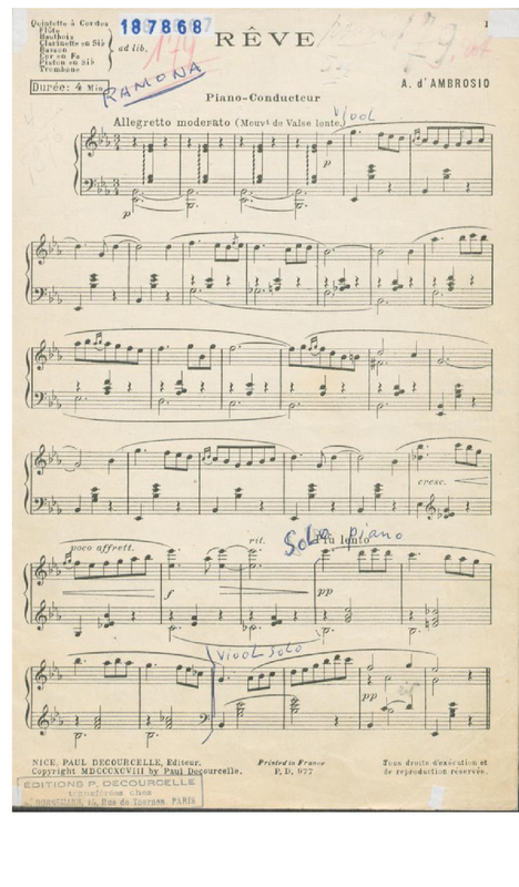 | Extra Information | Any relation to the Rêverie, Op.18 for violin and piano? (Not directly no.). BdlF lists a publication in 1898 of Rêve for string orchestra (pub. by Decourcelle.) Publication noted in the Bibliographie de la France 2e série, 87e année, Nº 33, 13 Août 1898, p.638, r.3935. |
