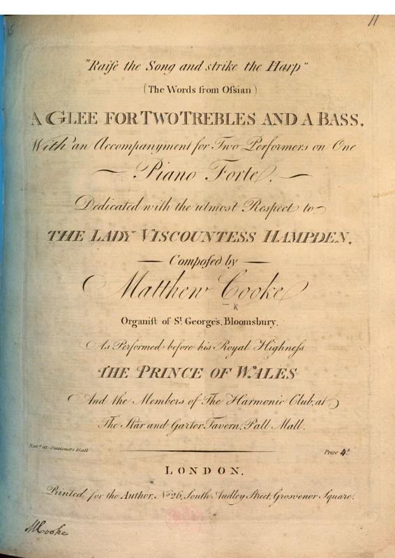 "Raise the Song and strike the Harp" (The Words from Ossian) A Glee for Two Trebles and a Bass With an Accompanyment for Two Performers on One Piano Forte