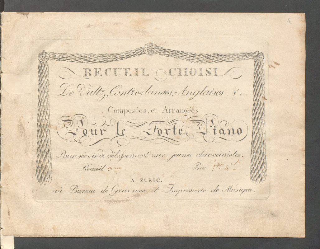 | Alternative. Title | Recueil choisi de waltz, contredanses, anglaises &c. Composées, et arrangées pour le forte piano, pour servir de délassement aux jeunes clavecinistes |