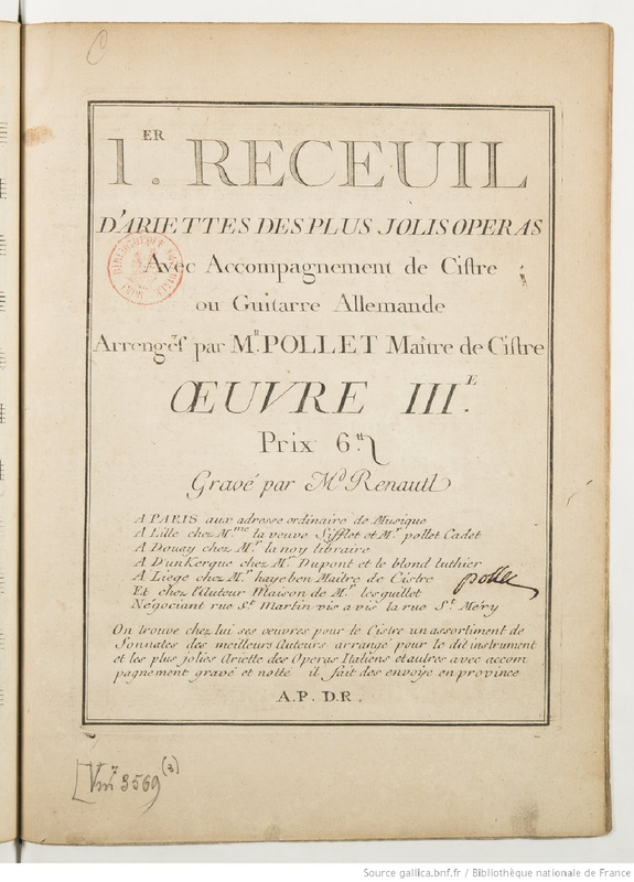 | Alternative. Title | Titre : Ier Recueil d'ariettes des plus jolis operas avec accompagnement de cistre ou guitare allemande arrangés |