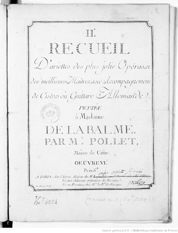 | Alternative. Title | IIe Recueil d'ariettes des plus jolie opéras, et des meillieurs maîtres, avec accompagnement de cistres ou guittare allemand |