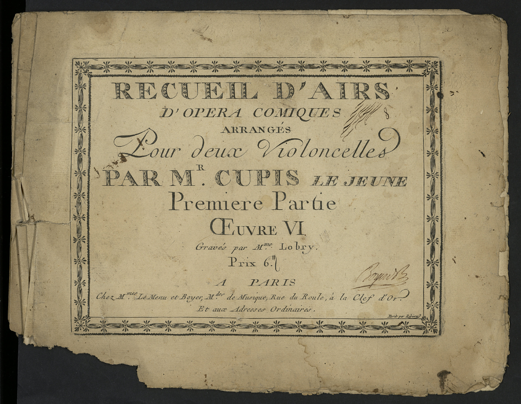 | Alternative. Title | Recueil d'airs d'operas comiques arranges pour deux violoncelles par Mr. Cupis le jeune. Premiere Partie, Oeuvre VI. |