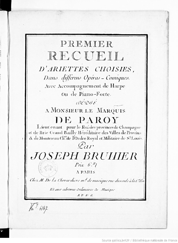 Contains arias from opéra comiques by Grétry, Rodolphe, and Lefroid de Méreaux. No. 6 is simply labelled as "Romance" with no composer. A modified version of the text was later used in a voice and harp/piano piece from 1810 titled "Romance de M. O." (set to different music). It is unknown if M.O. is the librettist or composer.