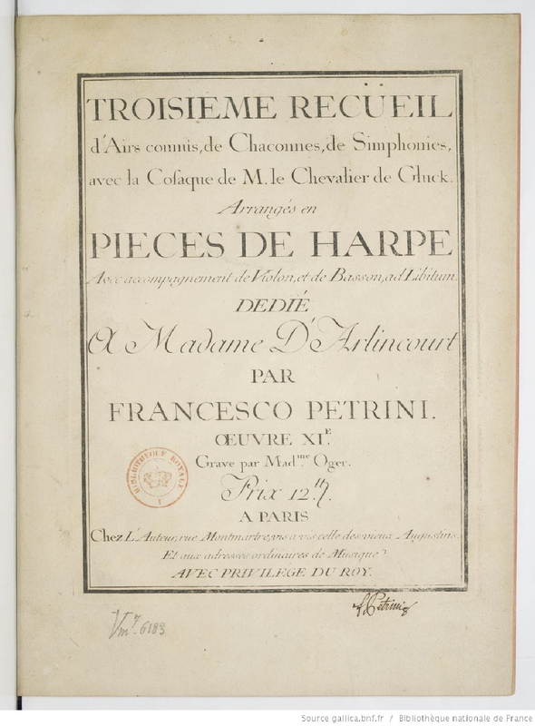 | Work Title | Troisième recueil d’airs connus, de Chaconnes, de Simphonies, avec la Cosaque de M. le Chevalier de Gluck. Arrangés en pièces de harpe Avec accompagnement de Violon, et de Basson, ad libitum. |