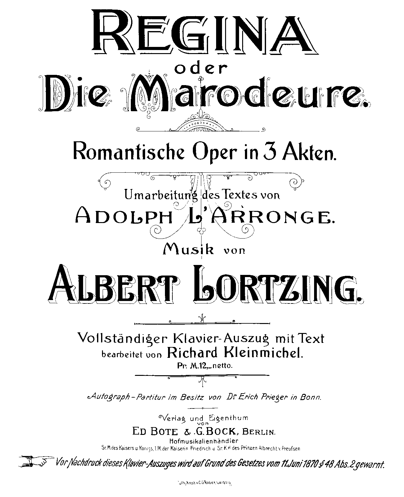 | First Publication. | 1851 – Berlin: Schlesinger — one vocal excerpt 1899 – Berlin: Bote & Bock — vocal score |