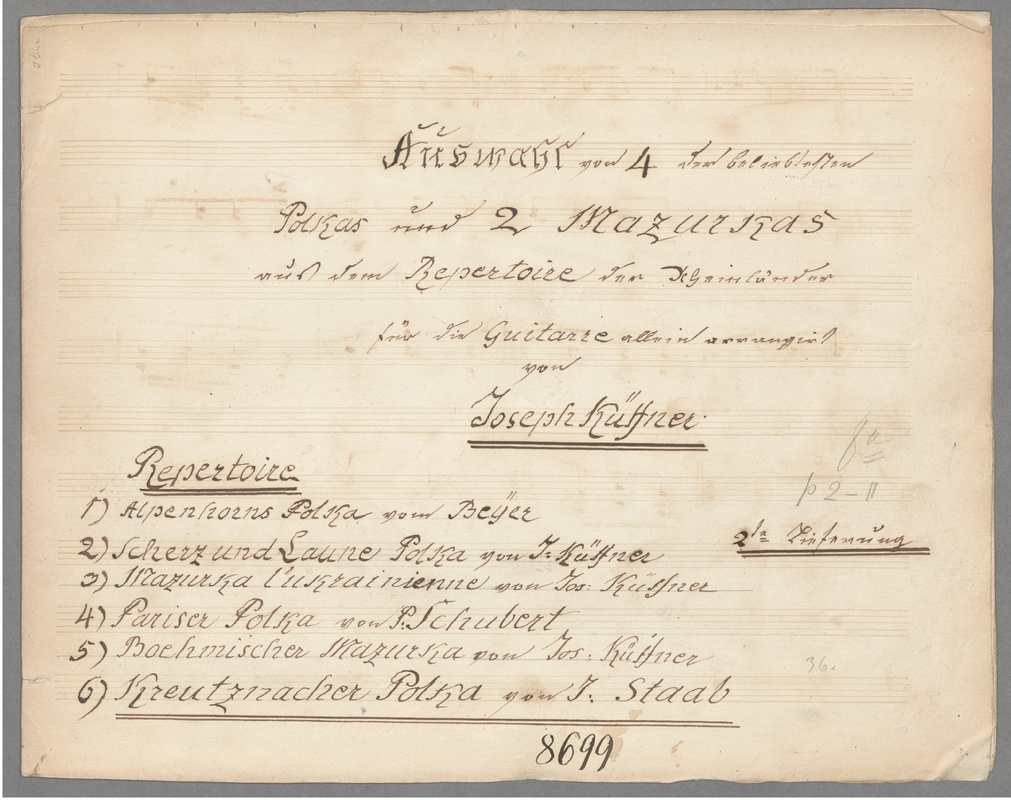 | Alternative. Title | Auswahl von der beliebtesten Polkas und Mazurkas aus dem Repertoire der Rheinländer für die Guitarre allein arrangirt von Joseph Küffner |