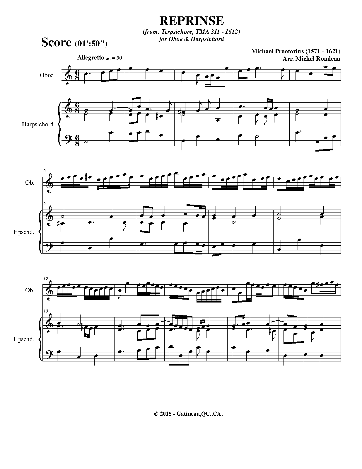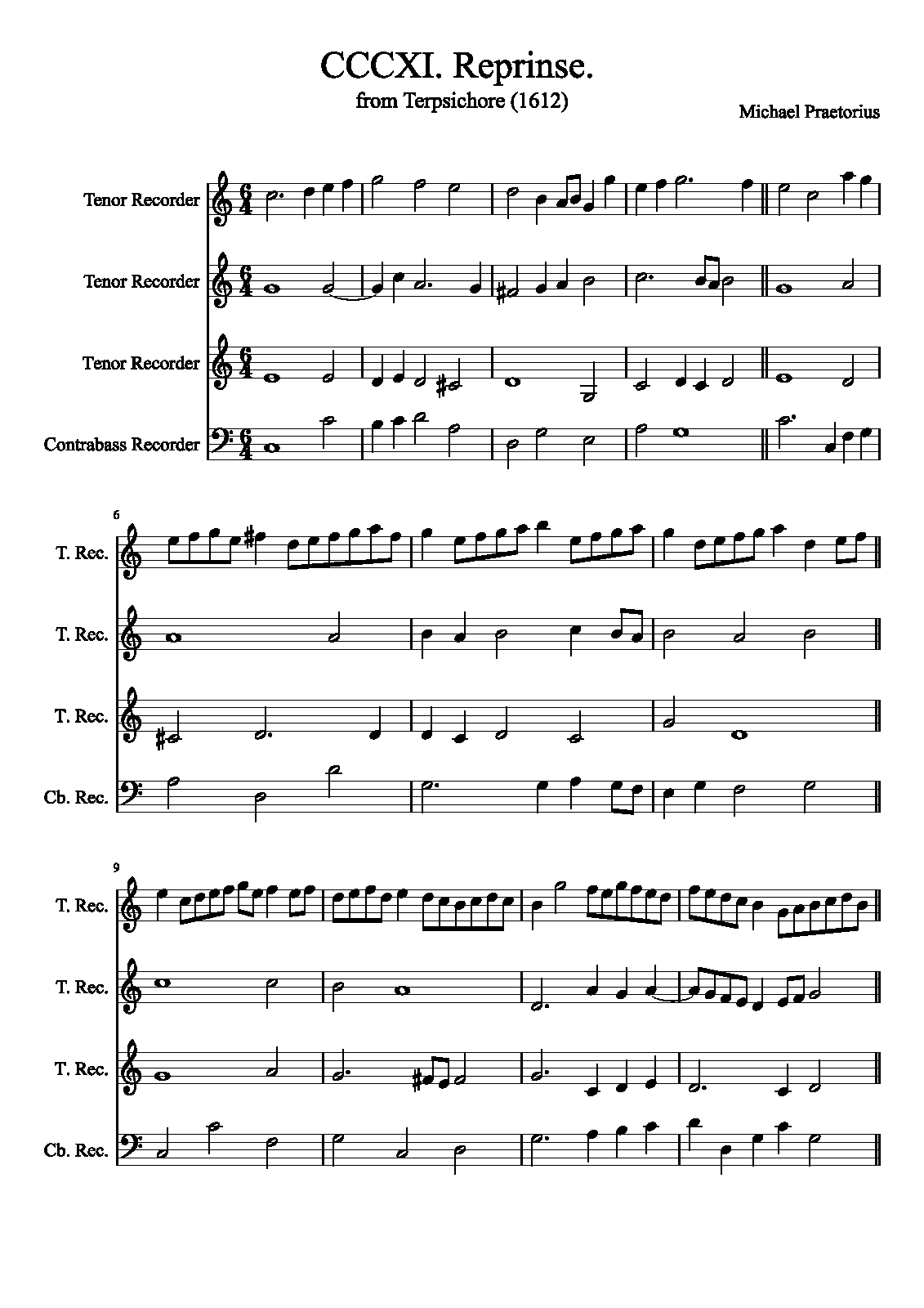 | Extra Information | These pieces were assembled and arranged by Praetorius for his 1612 collection. It is unknown how many, or if any, of the works in the collection were actually composed by Praetorius as opposed to being popular dance tunes arranged by him. The instrumentation is not specified in the original, and simply listed as "à 4". |