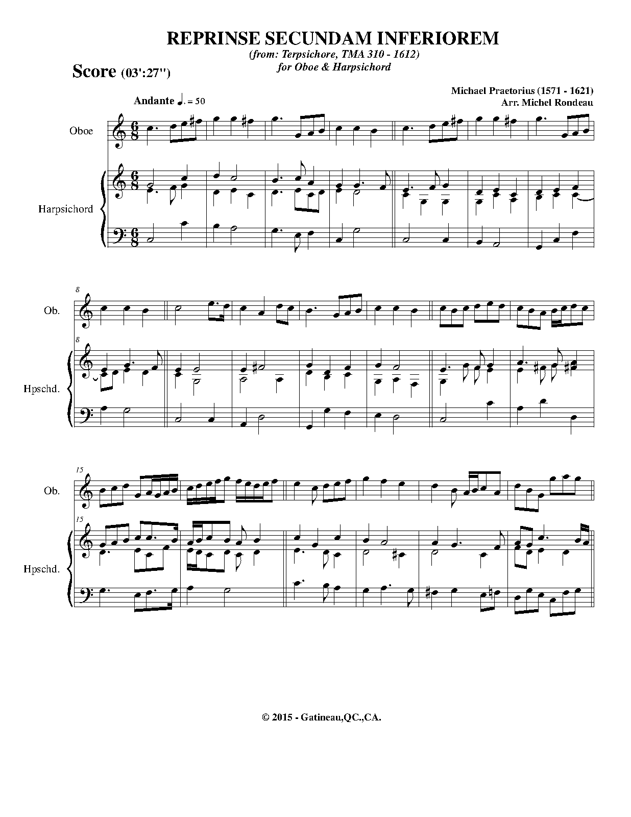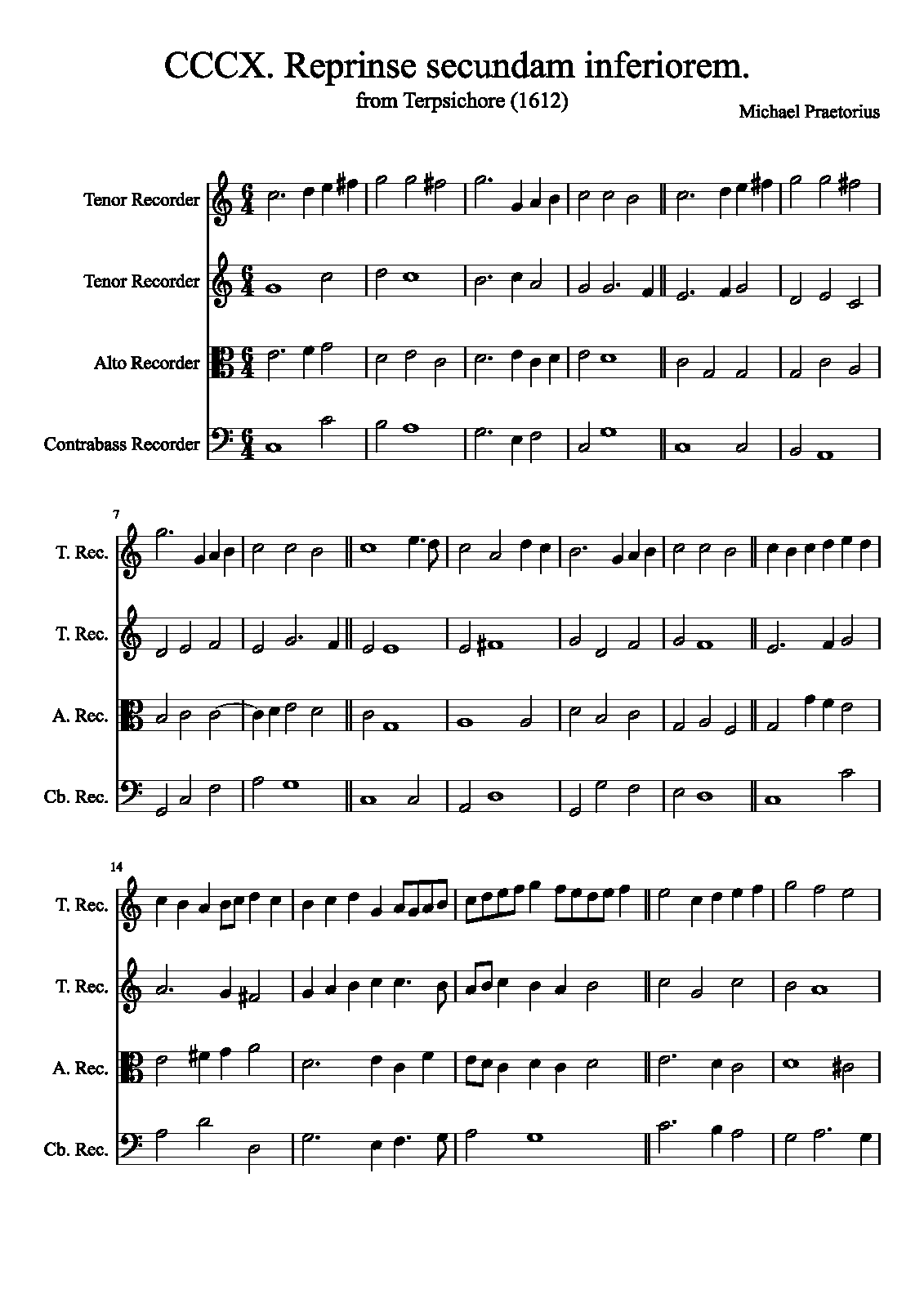 | Extra Information | These pieces were assembled and arranged by Praetorius for his 1612 collection. It is unknown how many, or if any, of the works in the collection were actually composed by Praetorius as opposed to being popular dance tunes arranged by him. The instrumentation is not specified in the original, and simply listed as "à 4". |