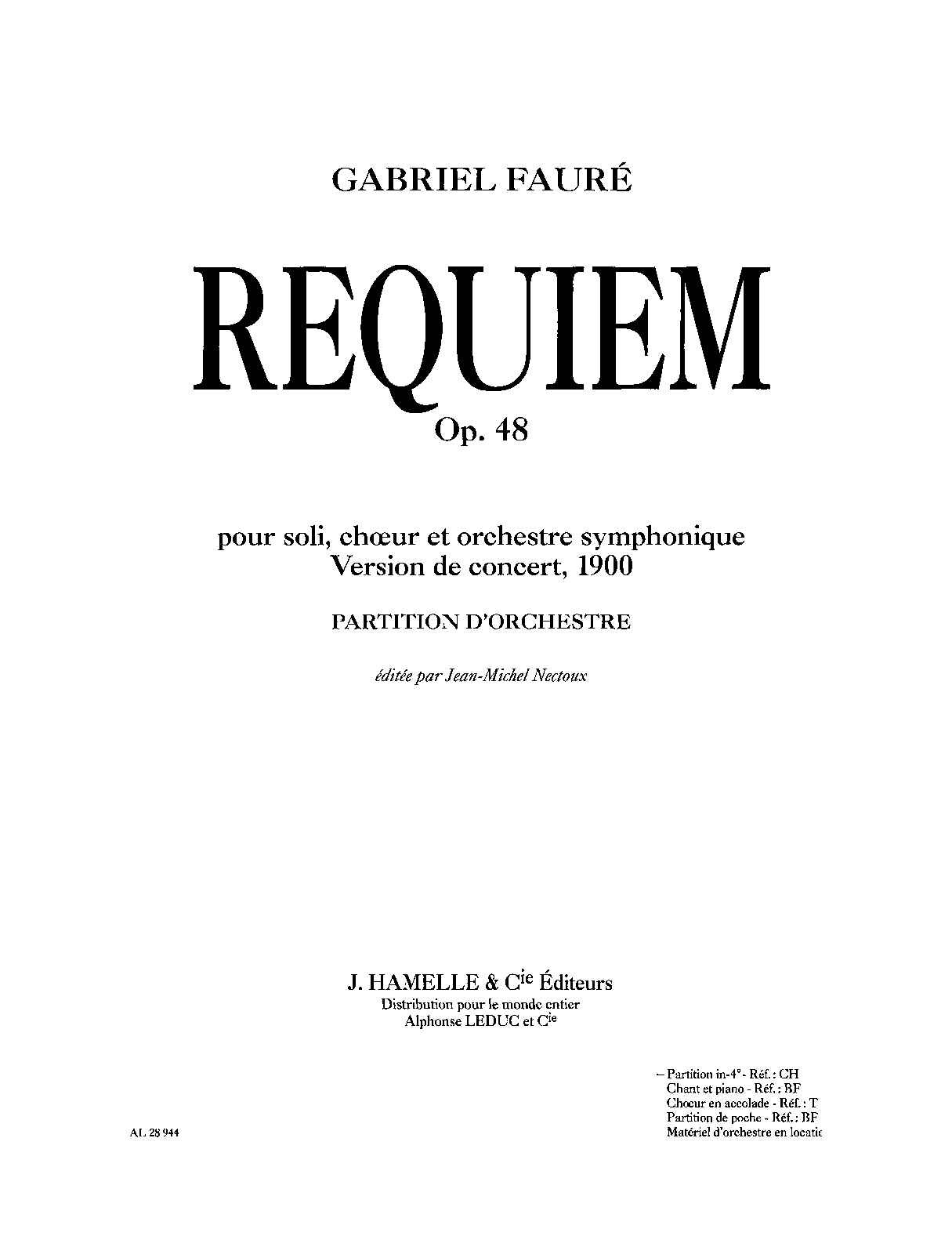 Misc. Notes Reconstruction of Fauré’s 1888 and 1893 versions, edited from the original (1900) full score published by J. Hamelle, with additions by Philip Legge. See also CPDL.