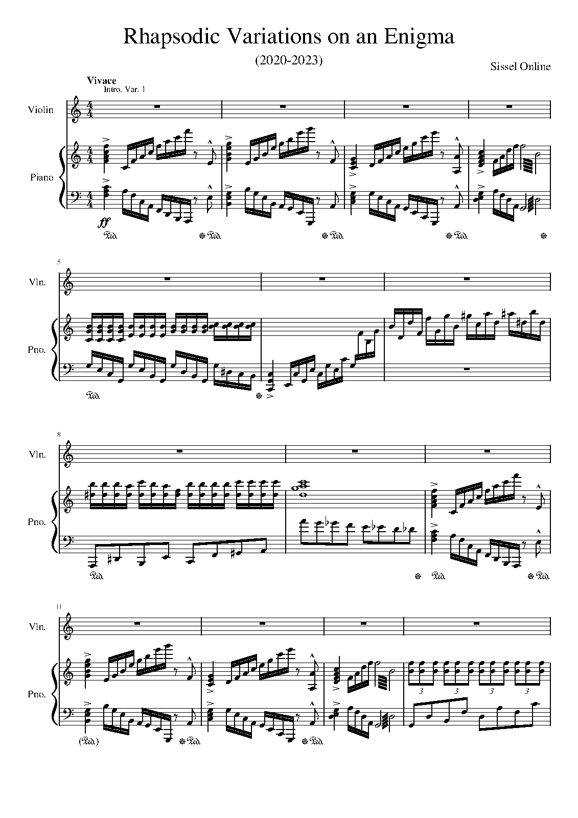 Well, this is not an enigma if you just jump to see the theme xD This is really one of my early works, inspired by one another variations on the same theme. Leave away any reality linkage, the theme is already very good on its own. Variation 1-5 and the theme were written in Dec 2020 - Jan 2021, but the Variation 6-7 were completed after a long hiatus in May - June 2023 (Before that only violin part is written), with edits in July 2023, thus the style difference. Technicallly I have to write a Related Work for this workpage, but for the Engima purpose, not gonna type that in. -Sissel