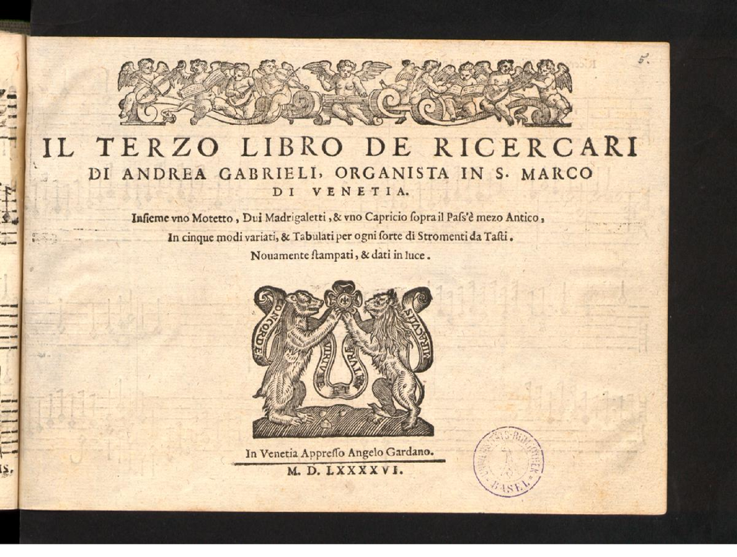 | Alternative. Title | Il terzo libro de ricercari di Andrea Gabrieli ... Insieme uno motetto, dui madrigaletti, & uno capricio sopra il pass'e mezo antico, in cinque modi variati, & tabulati per ogni sorte di stromenti da tasti |