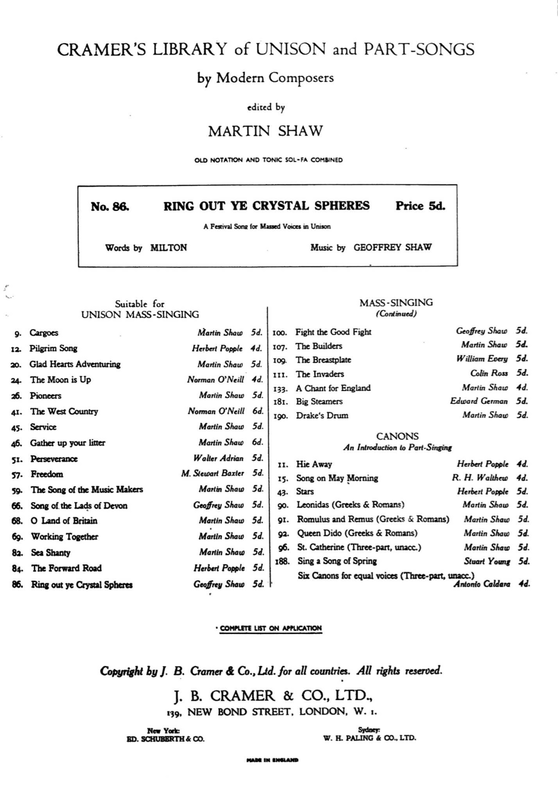 | Alternative. Title | A Festival Song for Massed Voices in Unison |