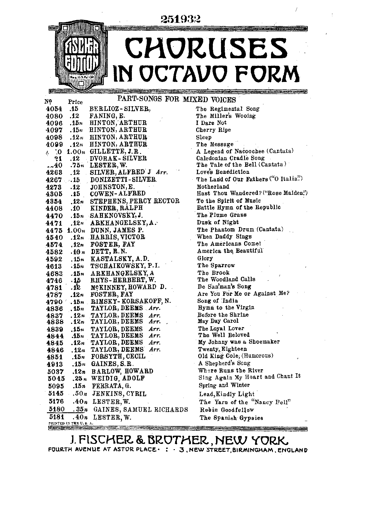 New York: J. Fischer & Bro., 1922. Plate J. F. & B. 5180-24.