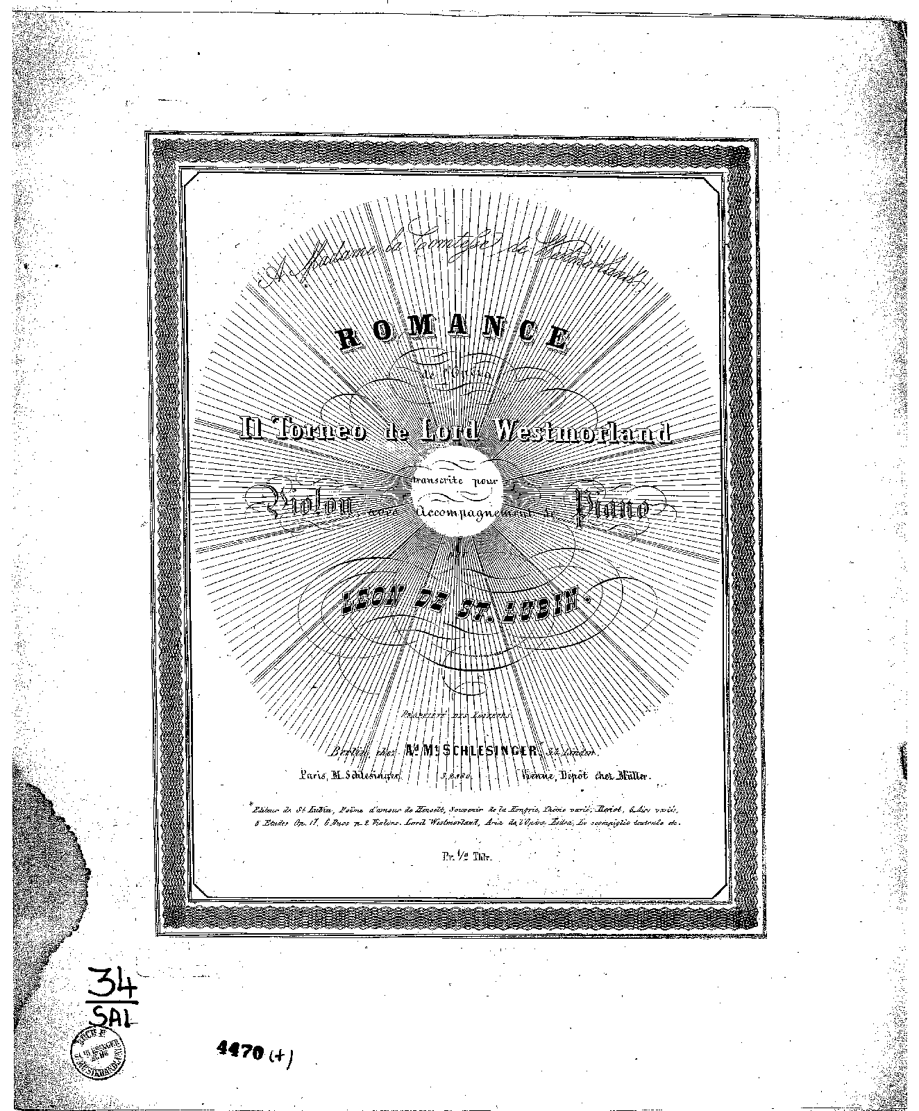 | Alternative. Title | Romance de l'opéra Il Torneo de Lord Westmorland transcrite pour violon avec accompagnement de piano |