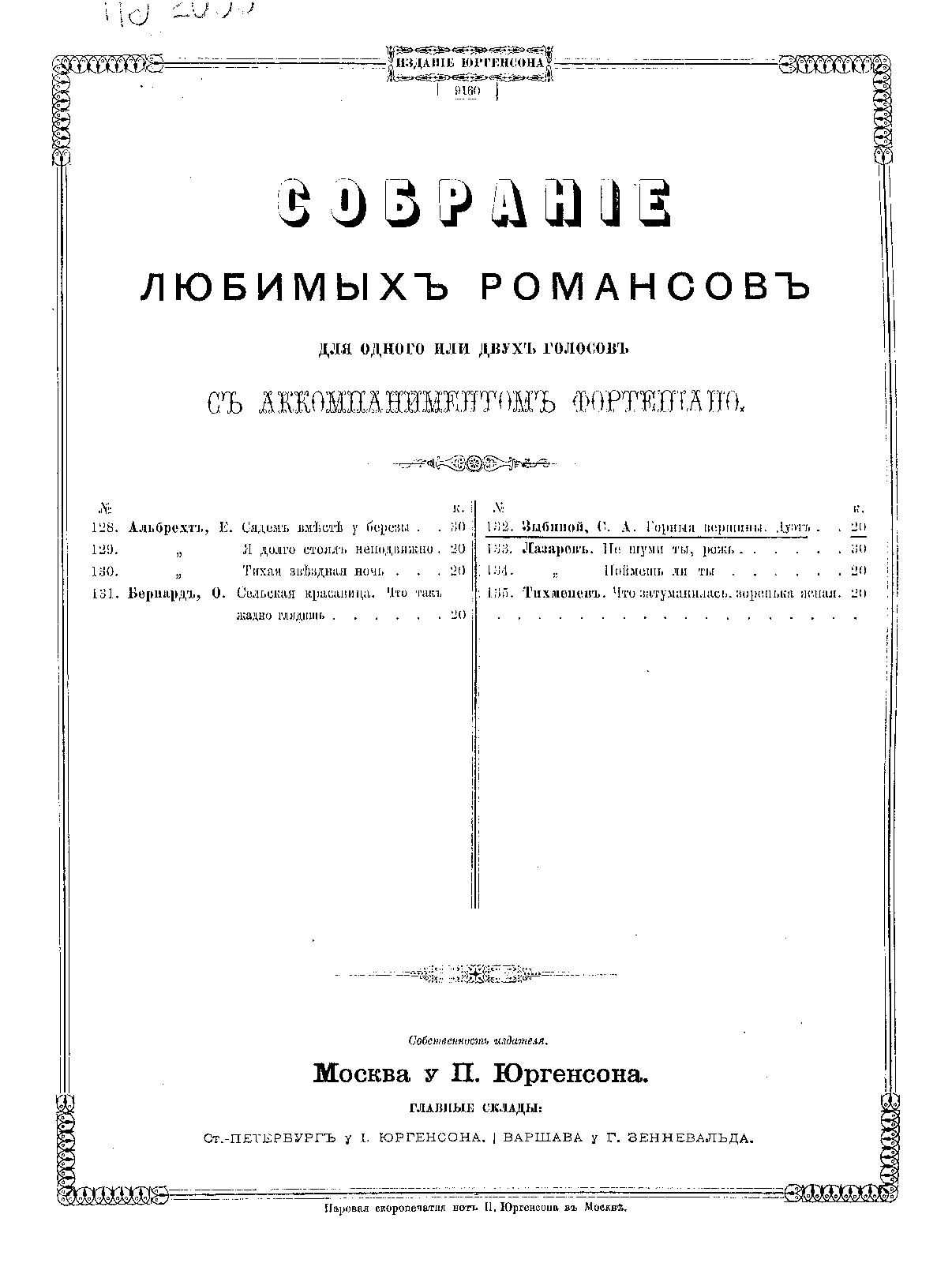 | Genre Categories | Romances; For voice, piano; For voices with keyboard; |