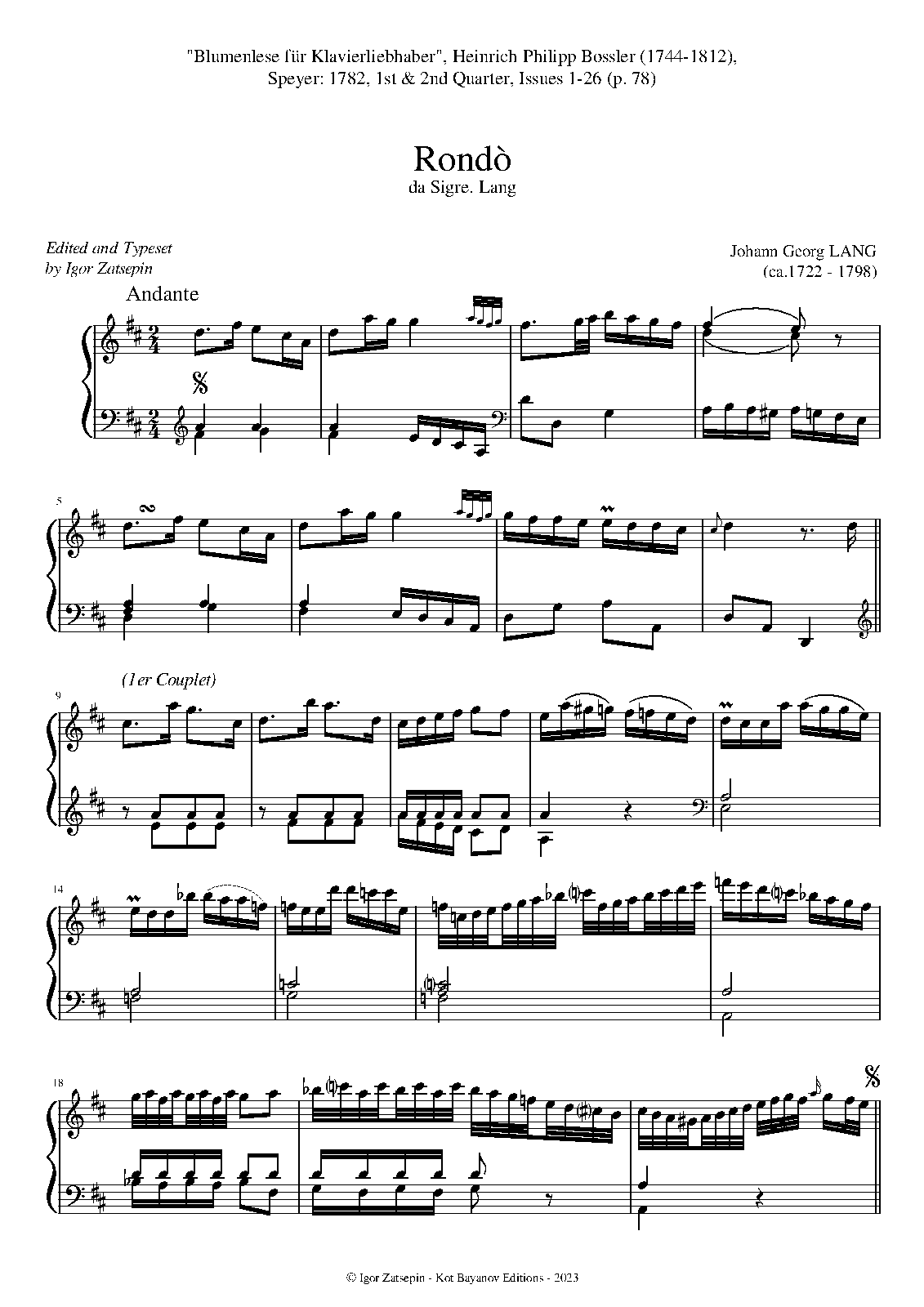 | Extra Information | Blumenlese für Klavierliebhaber, Speyer: 1782, 1st & 2nd Quarter, Issues 1-26 |