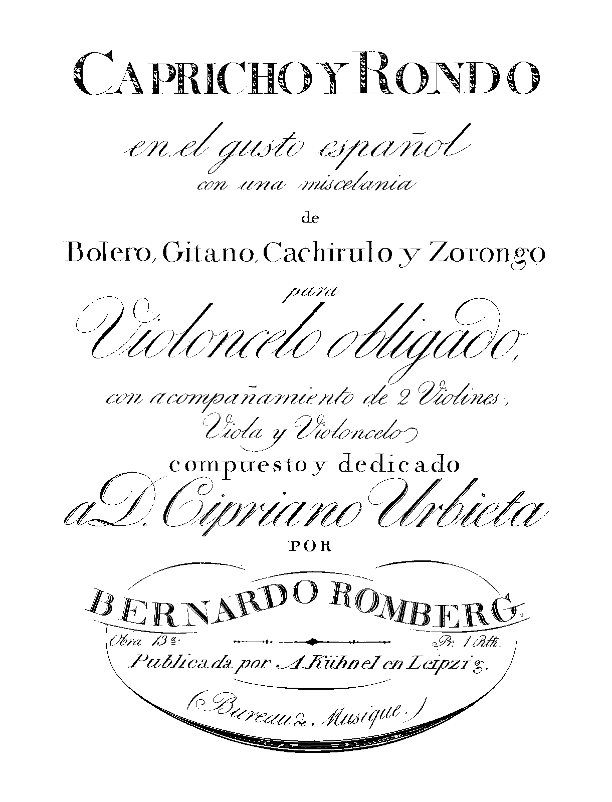 | Alternative. Title | Capricho y Rondo en el gusto español con una miscelania de Bolero, Gitano, Cachirolo y Zorongo para Violoncelo obligado, con acompañamiento de 2 Violines, Viola y Violoncelo |