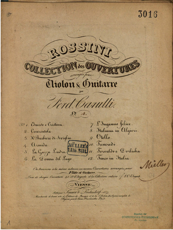 | Alternative. Title | Rossini Collection des Ouvertures arrangées pour Violon & Guitarre |