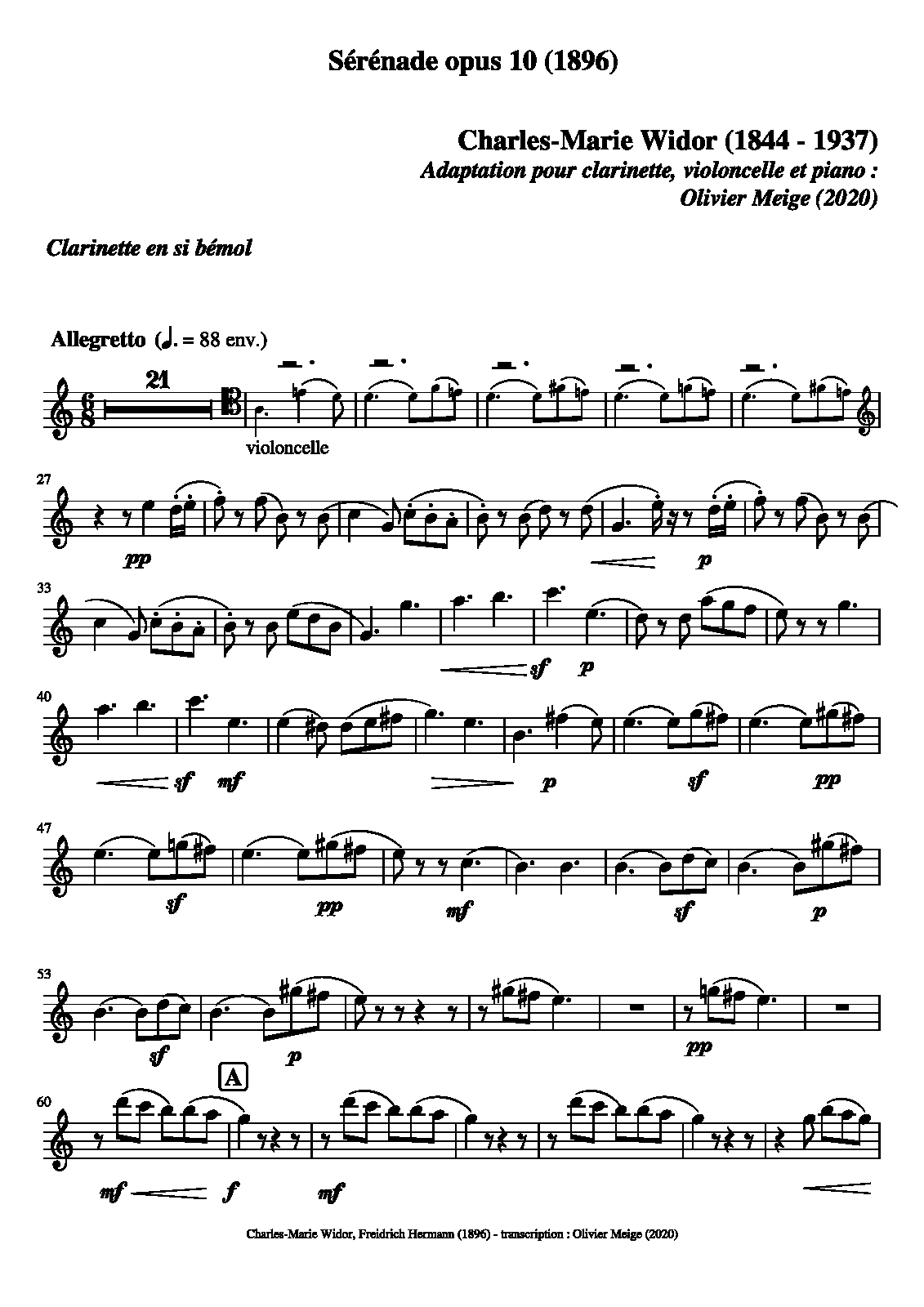transcription de la partie de violon pour clarinette en si bémol, dans la version de Widor et Hermann pour violon, violoncelle et piano