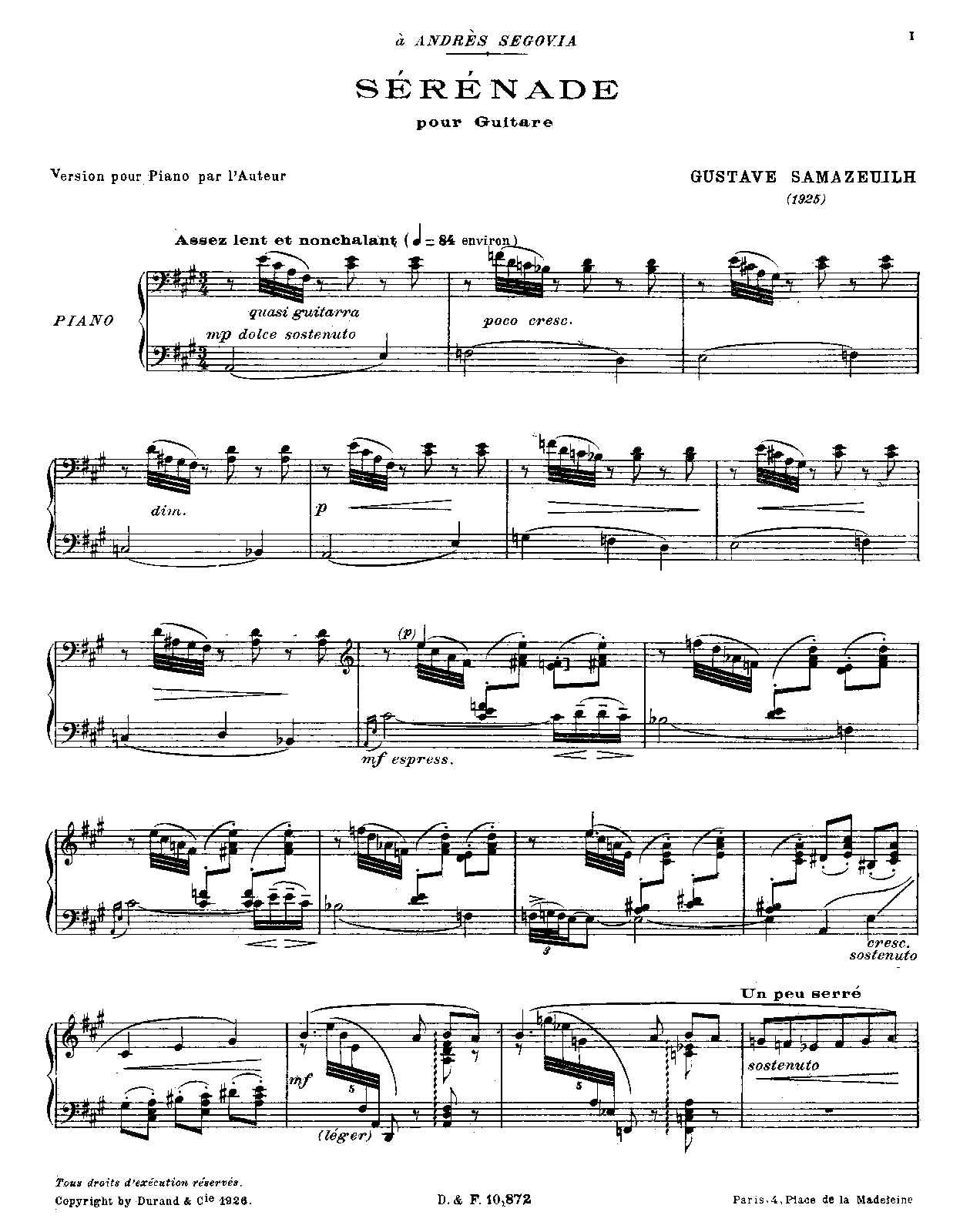 • The Sérénade was later used as the third movement in Samazeuilh's Esquisses for solo piano and requested to be played with the left hand only.