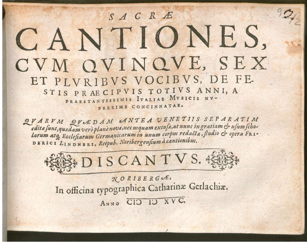 | Alternative. Title | Sacrae Cantiones cum quinque, sex et pluribus vocibus, de festis praecipuis totius anni, a praestantissimis Italiae Musicis nuperrime concinnatae ... |