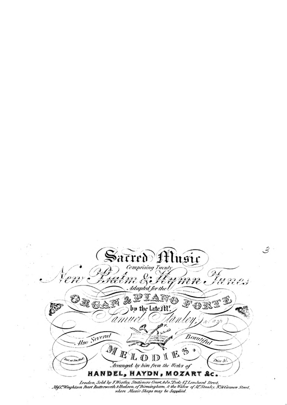 Sacred Music comprising Twenty New Psalm & Hymn Tunes adapted for the Organ & Piano Forte by the late Mr. Samuel Stanley, also several beautiful Melodies, arranged by him from the works of Handel, Haydn, Mozart &c.