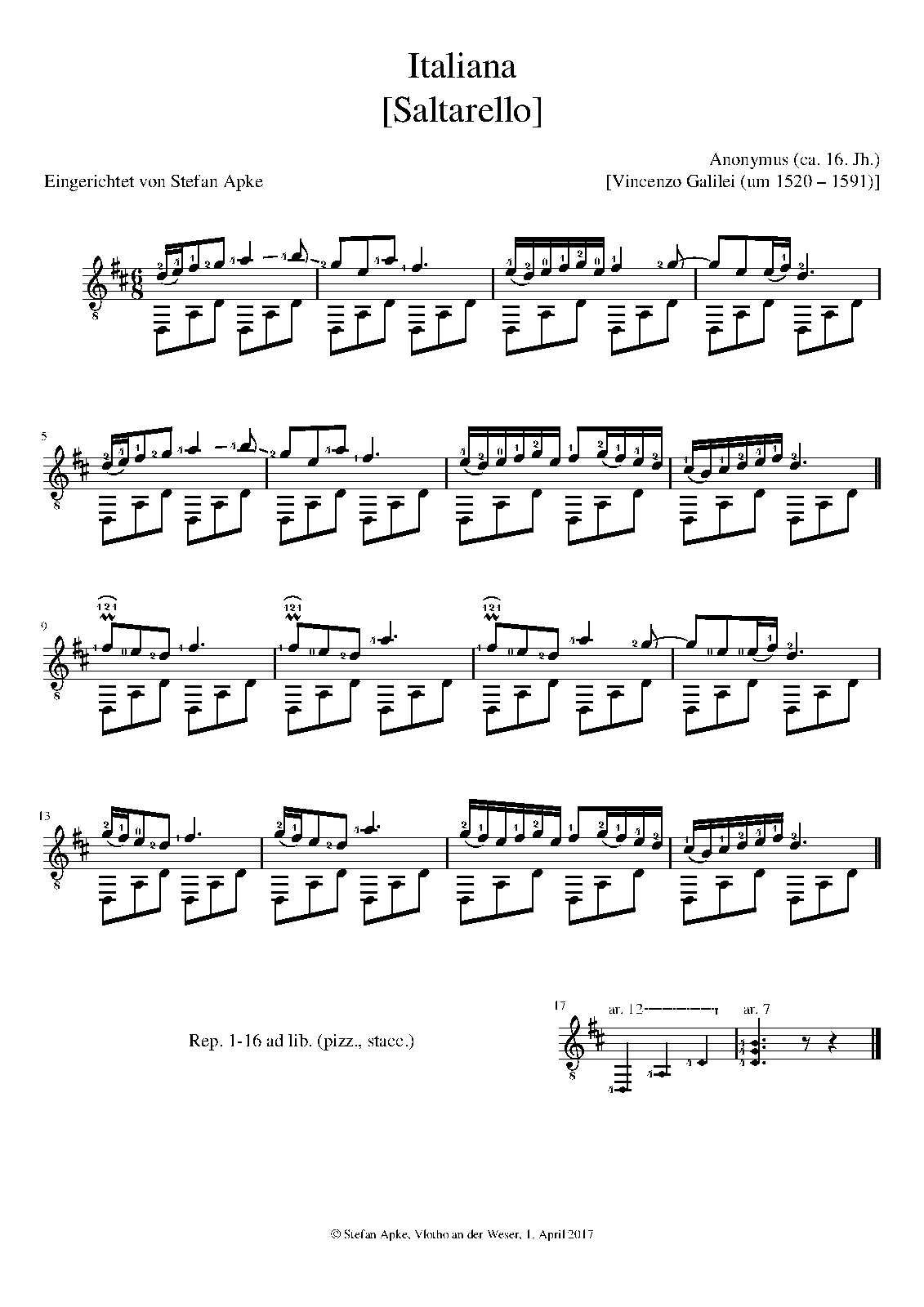 This piece is well known as "Saltarello" from Vincenzo Galilei (or from anonymous), but it is quite obvious, that it is an "Italiana" from anonymous and based on Oscar Chilesotti's transcription "No. 59. Italiana (Pag. 177 e 178 dell’ originale)" from his book "Da un Codice Lauten-Buch del Cinquecento".