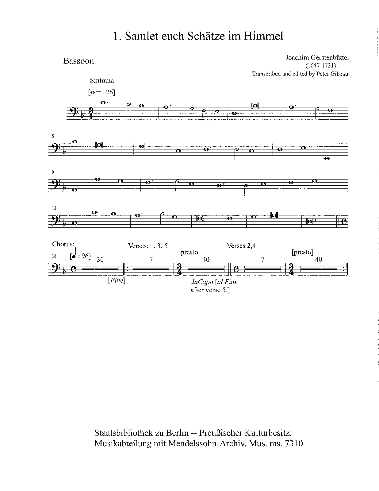 | Instrumentation | Voices: 2 sopranos, alto, tenor, bass; mixed chorus (SATB) Orchestra: bassoon, 2 violins, 2 violas, continuo |