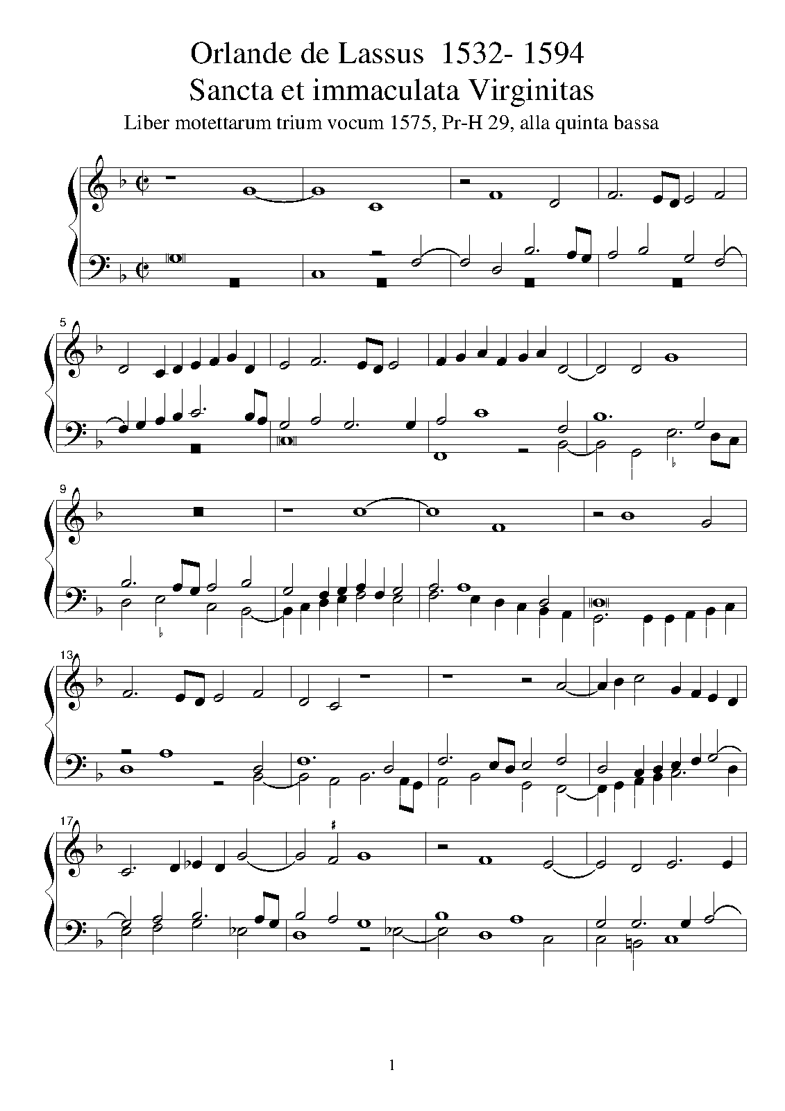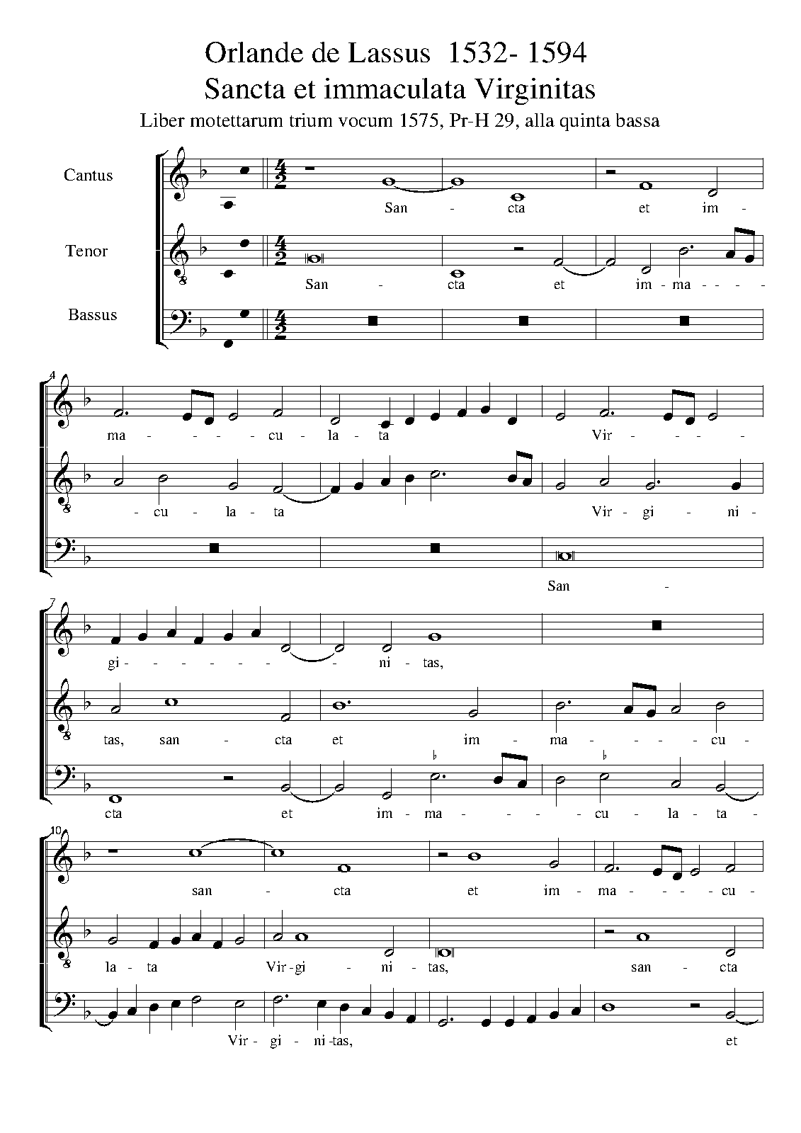 From Liber motettarum trium vocum, 1575; edition from a microfilm of the edition Paris 1581 and the edition Proske Haberle with corrections from the edition by Bergquist, Madison 2001. Because the original is provided with chiavetti an edition alla quinta bassa (a fifth lower) has been added.