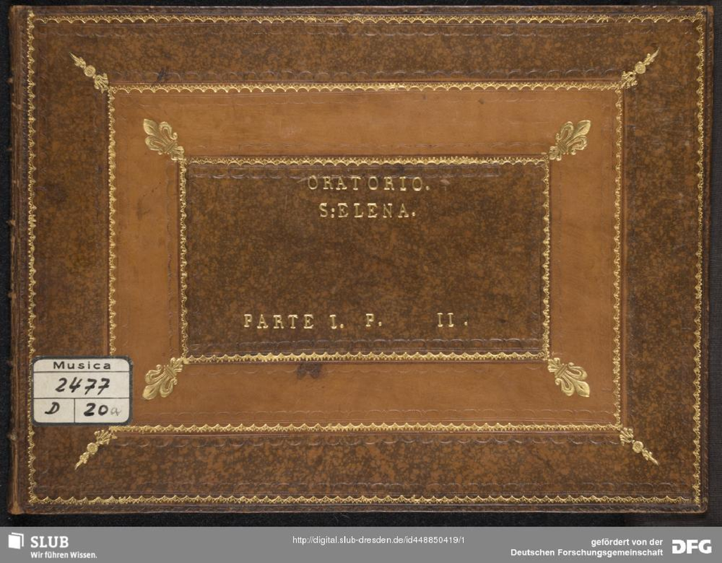 Alternative. Title SANT'ELENA AL CALVARIO. ORATORIO DA CANTARSI NELLA REGIA ELETTORAL CAPPELLA DI DRESDA IL SABATO SANTO. nell'anno 1746 Fu posto in Musica da Gio. Adol. Hasse Maestro di Capella di S. R. M.; La Santa Elena al Calvario. Oratorio del Sigre Metastasio. La Musica è dal Sigre Giovanni Adolfo Hasse, detto il Sassone.