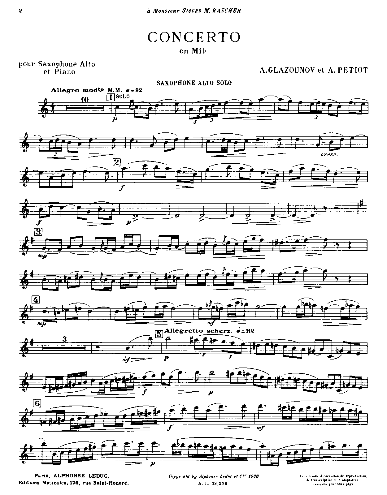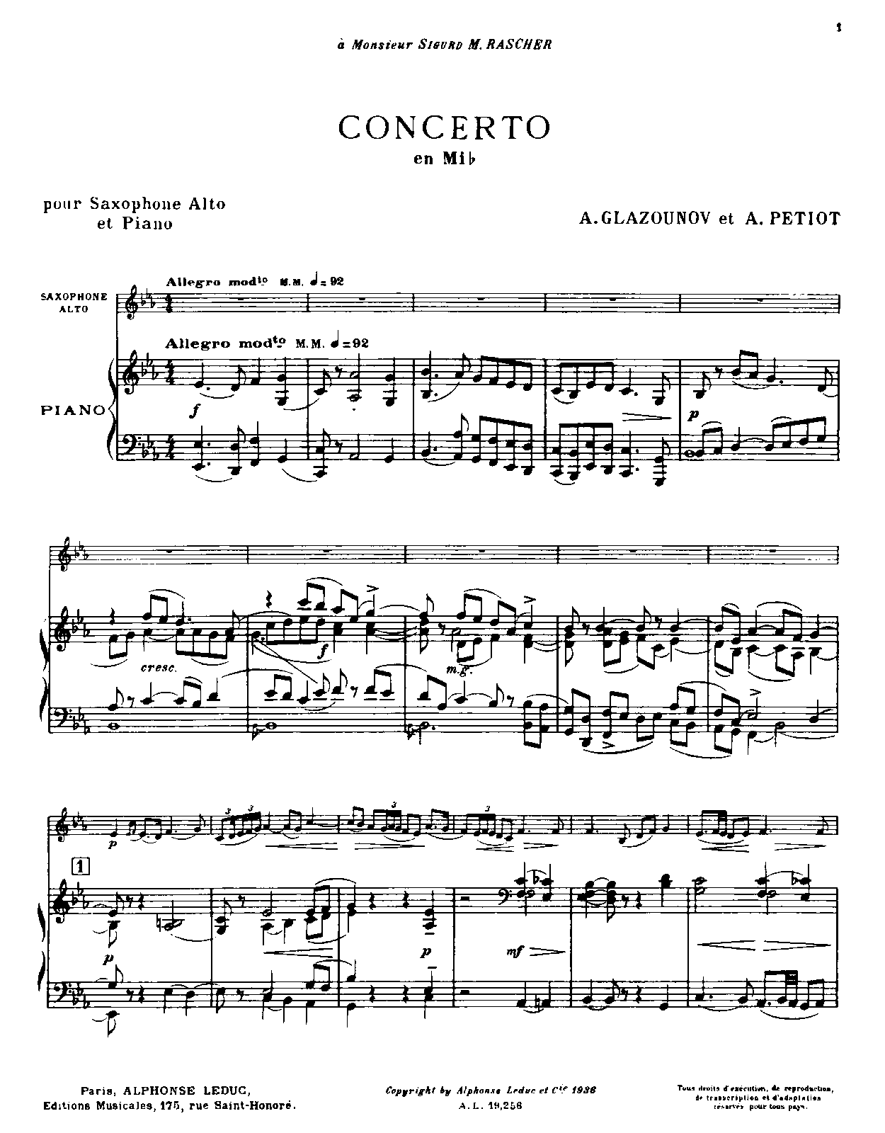 | Name Aliases | アルト・サクソフォーン協奏曲 (グラズノフ); アルト・サクソフォーンと弦楽オーケストラのための協奏曲 (グラズノフ); Concerto for Alto Saxophone and Strings in E-flat Major, Op. 109 |