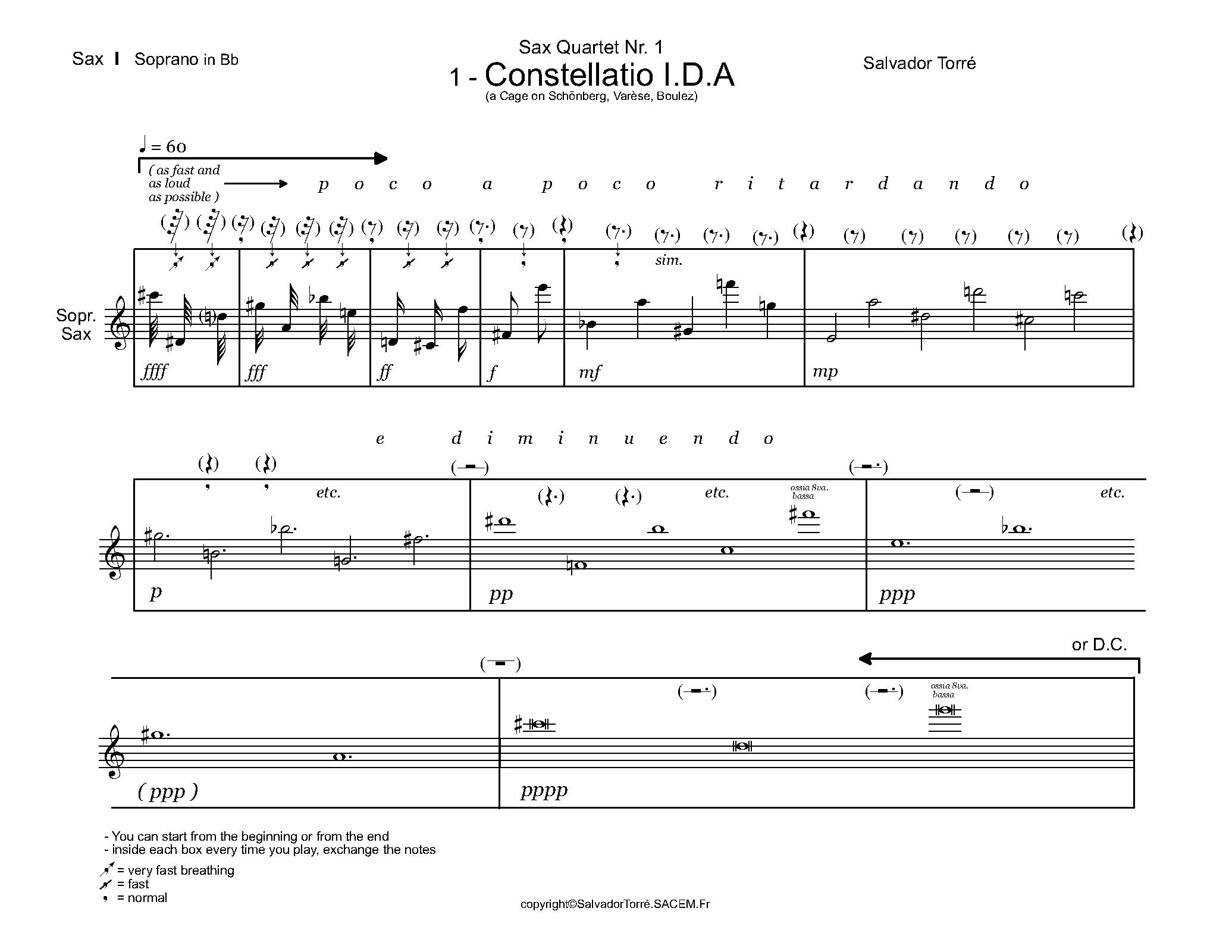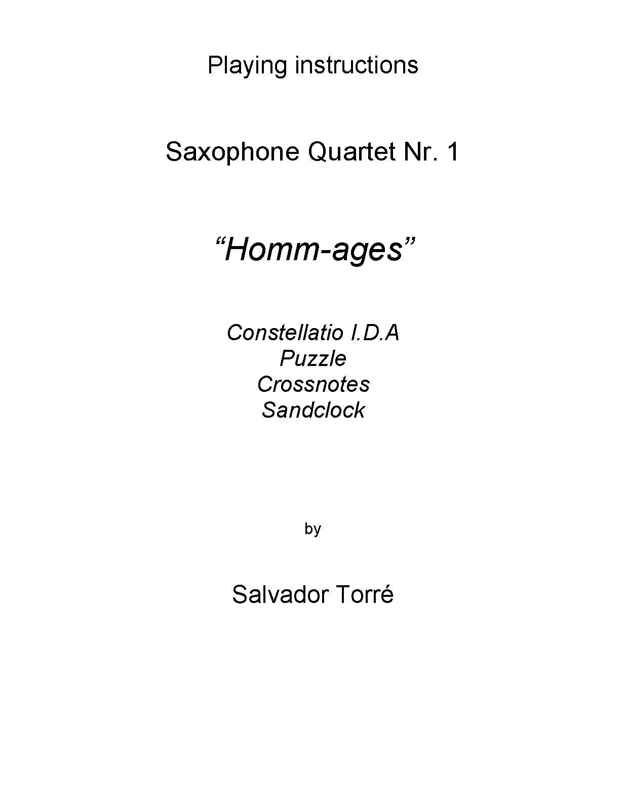 Saxophone Quartet Nr.1 by Salvador Torré is an adaptation or ‘exploration’ or 'explosion' (!) of a very flexible material coming from five easy pedagogical pieces composed in 1987. The musicians have to be spatialized in the concert hall. This Quartet consists in several tributes to the twentieth century composers who were pioneers of various musical revolutions. They are little musical pieces each one devoted to one or more composers and applying the technique that each composer utilized, for example: Cage utilized star maps to compose, hence a constellation is formed, Messiaen was inspired by the birds singing and their intricate rhythms, Berio used a novel space-time writing but that space-time was already inherent in musical notation invented by Guido D'Arezzo in the year one thousand. Reich uses a melodic cell repeated ad infinitum but it changes imperceptibly. With all this we find that these procedures existed in other eras of history of music, only under a different light. Each musician plays each of these pieces of (almost) -independent, so that each piece or movement is a kind of "collage" in which the piece overlaps itself, this overlap must be set to the sound space thanks to which musicians are placed in different parts of the concert-hall spreading sounds among the public, providing distance and location of sound sources in three dimensional space.