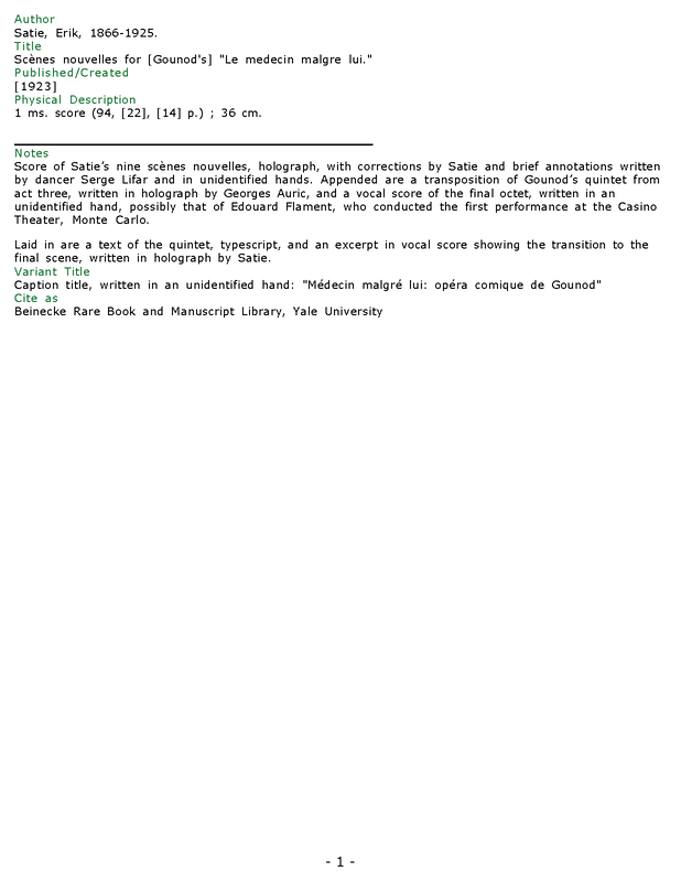 Misc. Notes Nine additional scenes composed for a 1924 performance in Monte Carlo of the opera Le médecin malgré lui by Gounod. Includes corrections by the composer and brief annotations written by dancer Serge Lifar and unidentified hands. Appended are a transposition of Gounod's quintet from act three, written in holograph by Auric, and a vocal score of the final octet, written in an unidentified hand, possibly that of Edouard Flament, who conducted the first performance. Laid in are a text of the quintet, typescript, and an excerpt in vocal score showing the transition to the final scene, written in holograph by Satie.