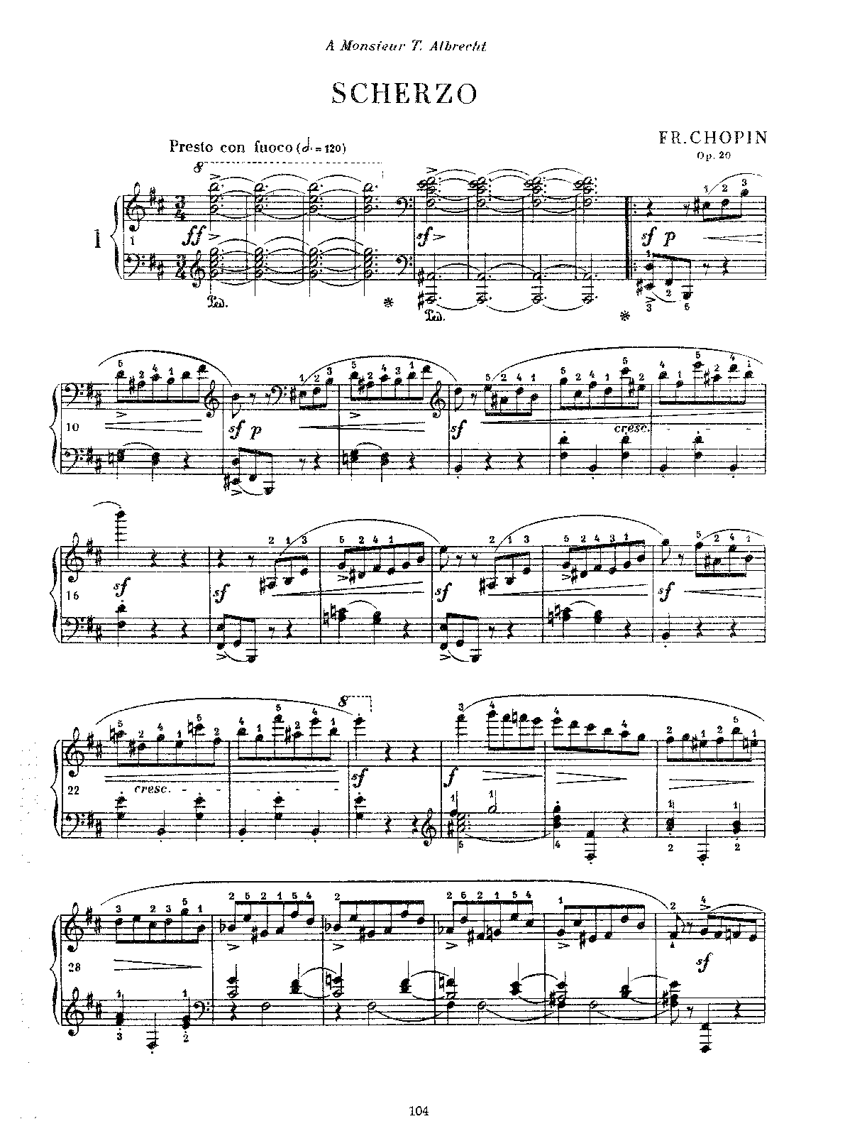 Name Aliases Scherzo for piano No. 1 in B minor, Op. 20, CT. 197; Scherzos, piano, no. 1, op. 20, B minor