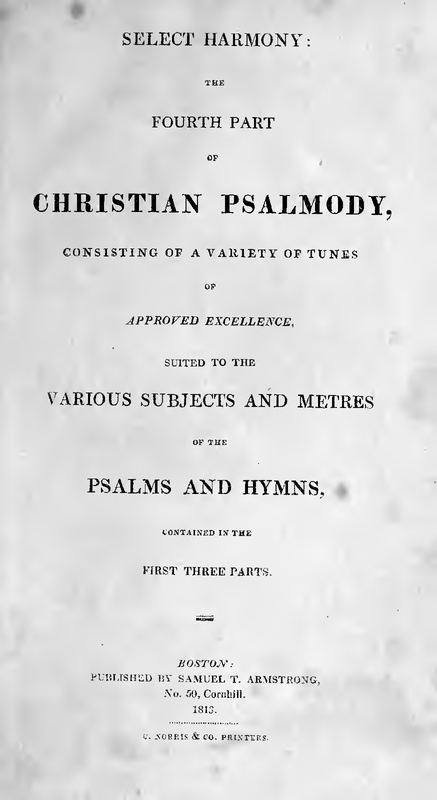 | Alternative. Title | Select Harmony: the fourth part of Christian Psalmody, consisting of a variety of tunes of approved excellence, suited to the various subjects and metres of the psalms and hymns, contained in the first three parts. |