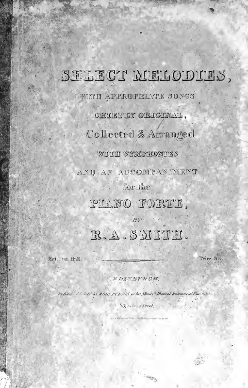 | Alternative. Title | Select Melodies with Appropriate Songs, Chiefly Original. Collected and Arranged with Symphonies and an Accompaniment for the Piano Forte by R. A. Smith |