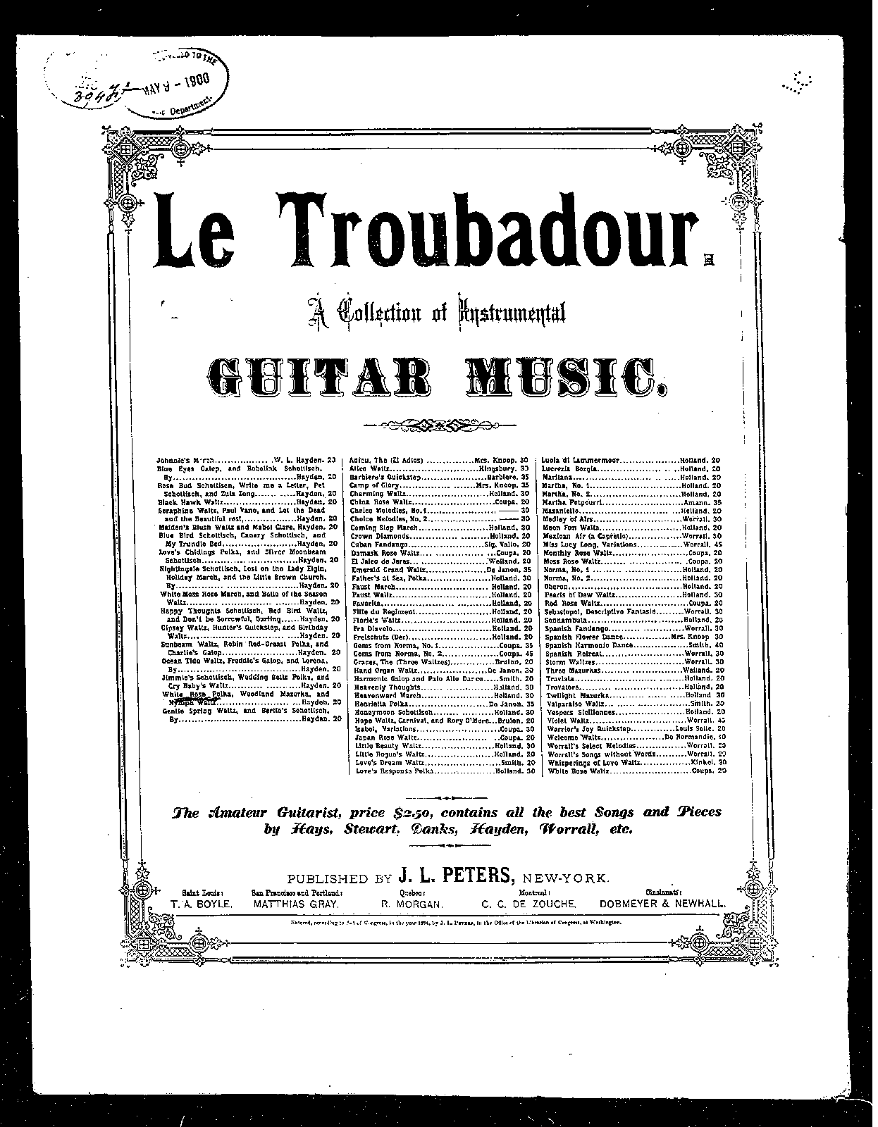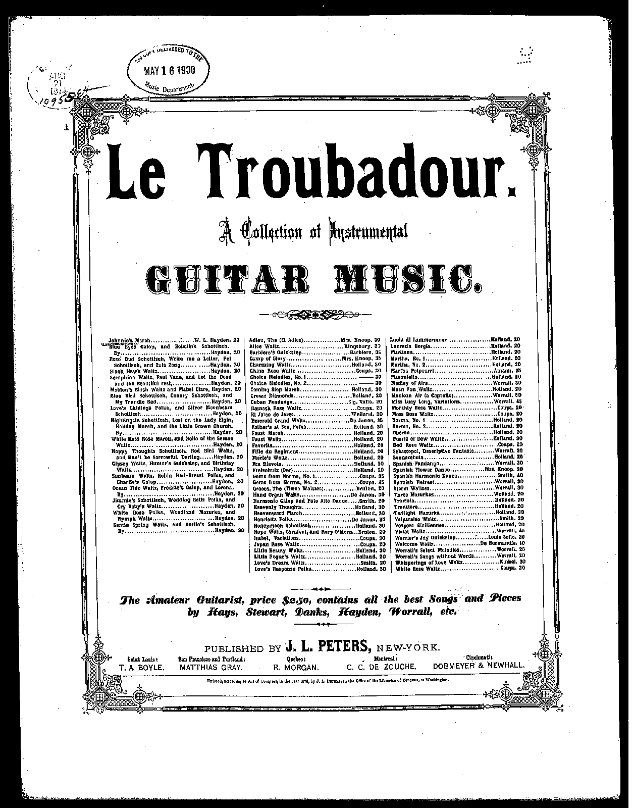⇒ 13 more: 2. Blue eyes Galop; Bob-o-link Schottisch • 3. Four Pieces for Guitar • 4. The Blackhawk Waltz • 5. Seraphine Waltz; Paul Vane; Let the Dead and the Beautiful Rest • 6. Maiden's Blush Waltz; Mabel Clare • 7. Blue Bird Schottisch; My Trundle Bed; Canary Schottisch • 8. Love's Chidings Polka; Silver Moonbeam Schottisch • 9. Four Guitar Pieces • 10. White Moss-Rose March; Belle of the Season Waltz • 11. Three Guitar Pieces • 12. Gipsy Waltz; Hunter's Quickstep; Birthday Waltz • 13. Sunbeam Waltz; Robin Red-Breast Polka; Charlie's Galop • 14. Ocean Tide Waltz; Freddie's Galop; Lorena