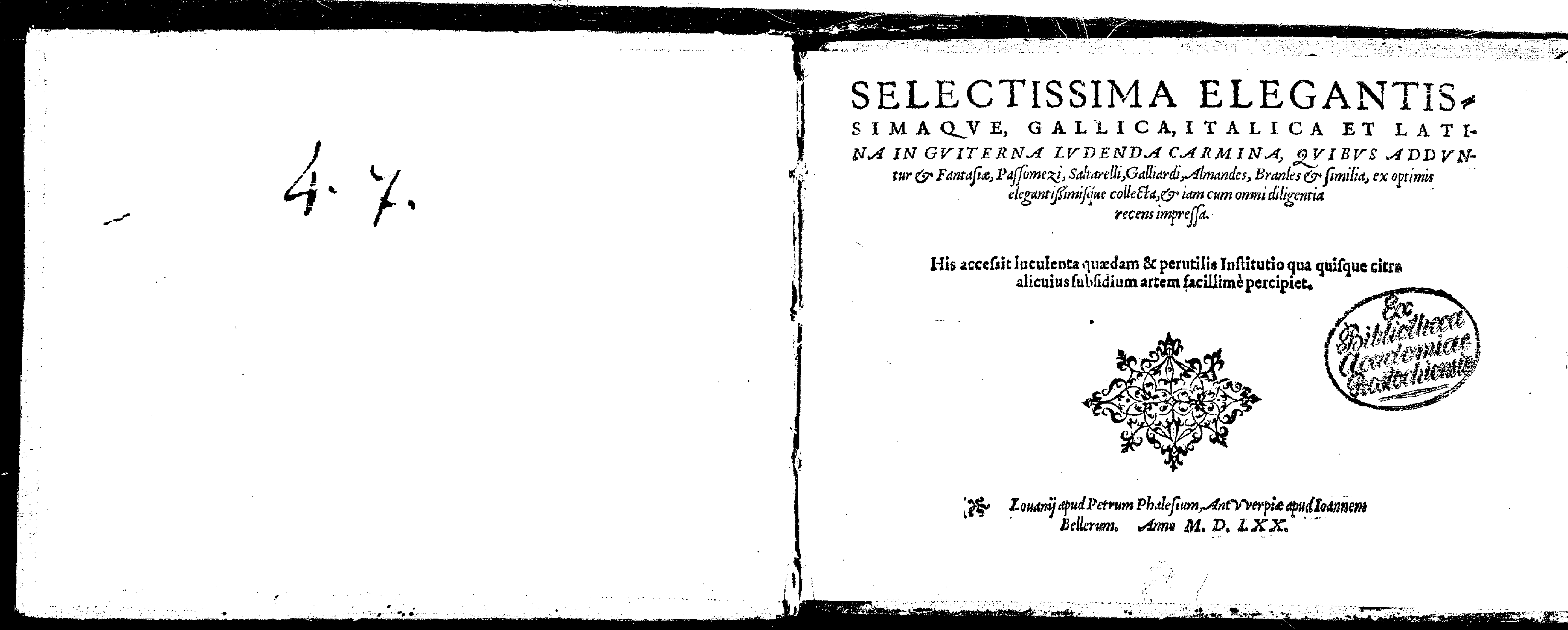 | Alternative. Title | Selectissima elegantissima qve, gallica, italica et latina in gviterna lvdenda carmina, qvibvs addvntur & fantasiae, Passomezi, saltarelli, galliardi, almandes, branles & similia, ex oprimis elegantissimisque collecta, & iam cum omni diligentia recens impressa |
