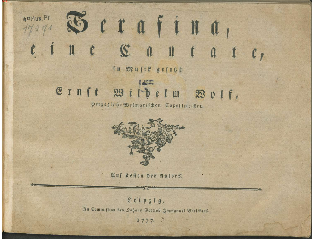 | Alternative. Title | Serafina, eine Cantate, in Musik gesetzt von Ernst Wilhelm Wolf, Herzoglich-Weimarischen Capellmeister |