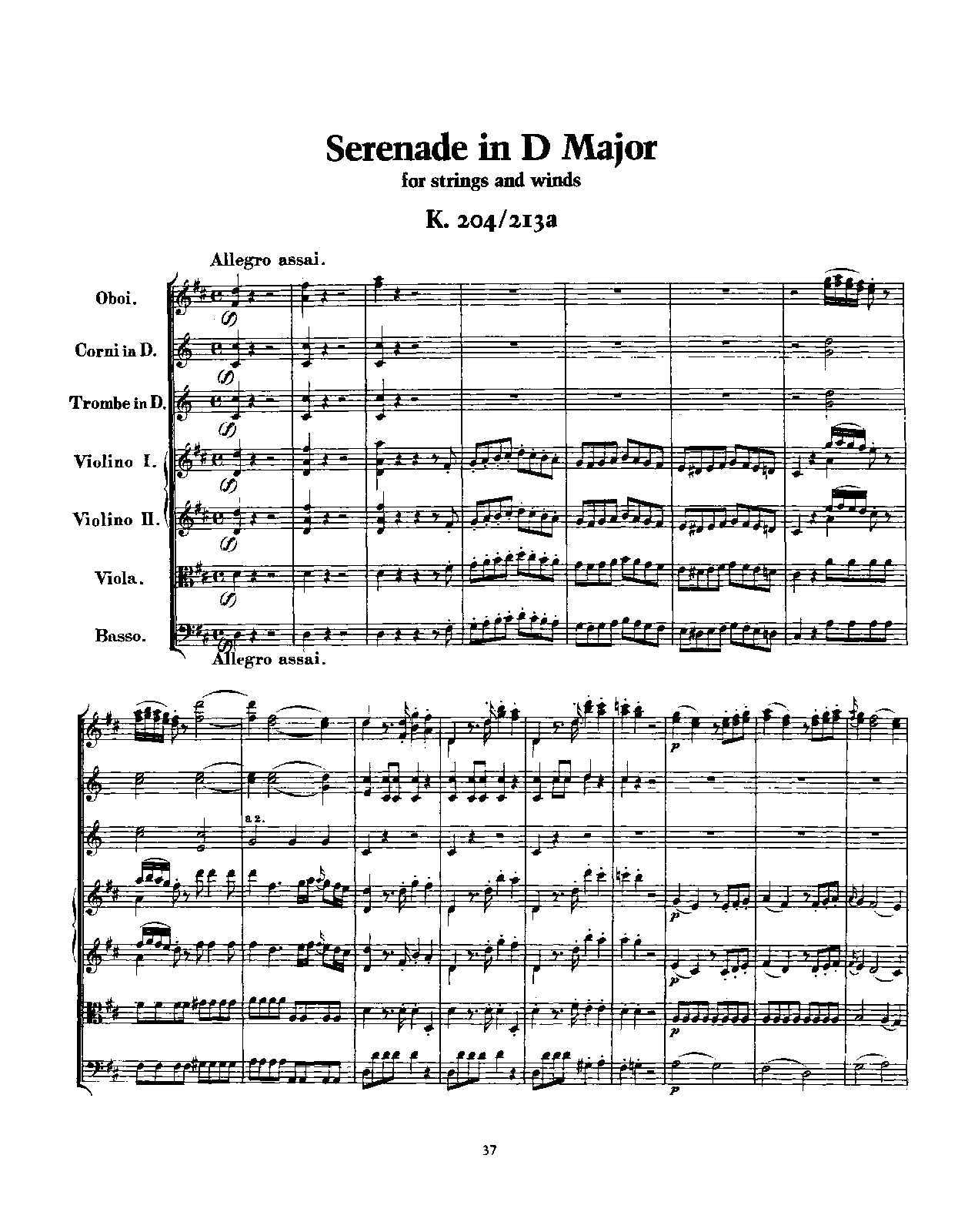 Misc. Notes Movements 2-4 of the Serenade were removed to create this arrangement. Also known as Sinfonie in D nach der Serenade KV 204.