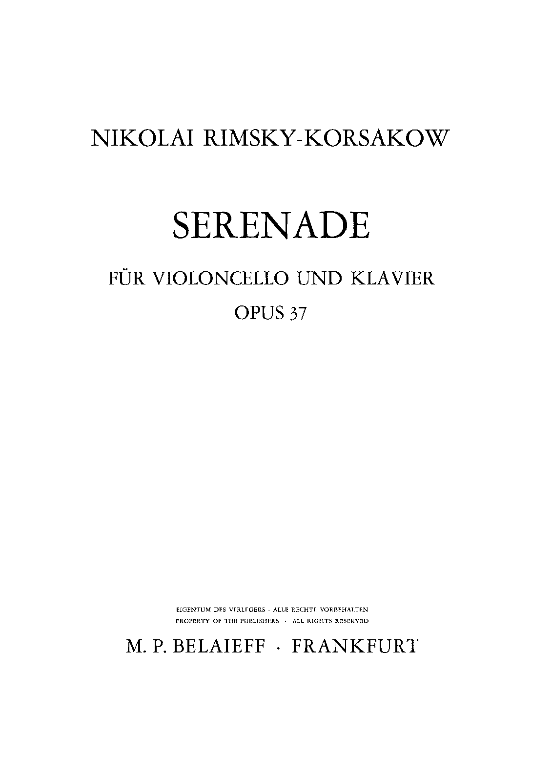 | First Publication. | 1895 – Leipzig: M.P. Belaieff (cello and piano version) 1964 – Moscow: Muzgiz. Arrangement for cello and orchestra (in vol.26 of Nikolay Rimsky-Korsakov: Complete Collected Works). Plate М. 31083 Г. |