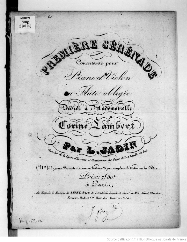Premiere Sérénade Concertante pour Piano et Violon ou Flute obligée ... par L. Jadin ... Na. Il y a une Partie de Basson ou Violoncelle pour remplacer le Violon ou la Flute