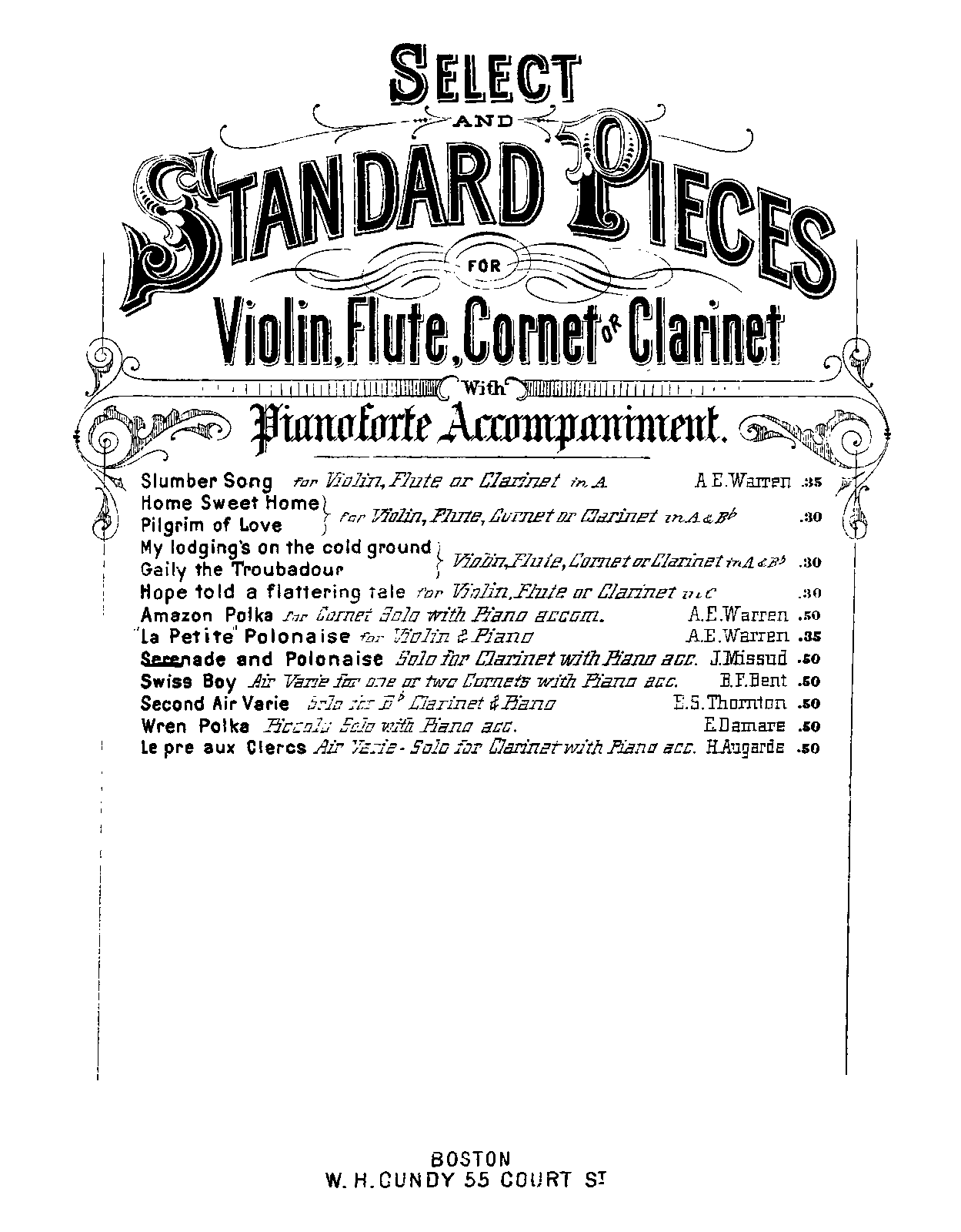 As Missud (himself a clarinetist) was the conductor of the Salem Cadet Band by 1879 the work may have originally been for clarinet and wind band. The fact that the clarinet/piano version exists as parts and not a piano score with a clarinet part perhaps also suggests an original version for clarinet and wind band. The clarinet part carries no plate number and has its own copyright notice--perhaps it was part of the engraved set of parts for the wind band version.