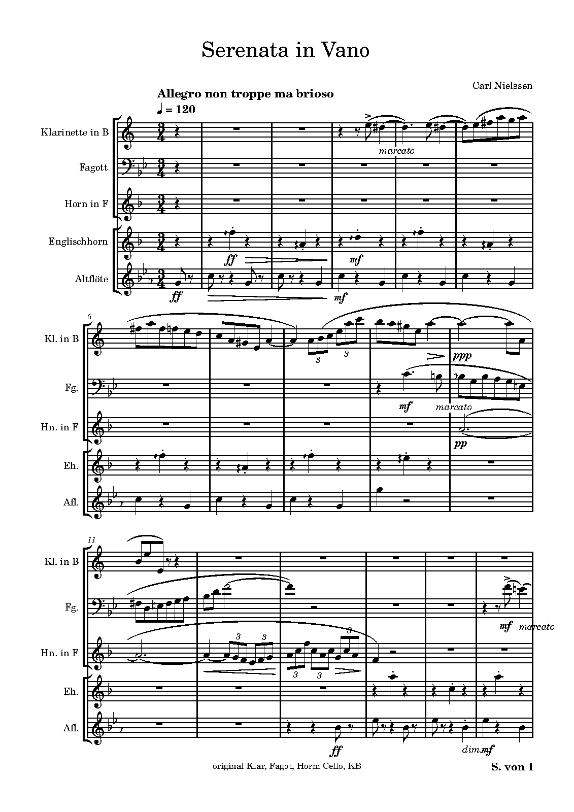 | Extra Information | Nielsen seems to have composed his quintet, Serenata in vano, in May 1914, that is before he began composing his Fourth Symphony (CNW 28) in the summer. The quintet was performed on a concert tour in the provinces by members of The Royal Danish Orchestra, who probably also commissioned the composition. |