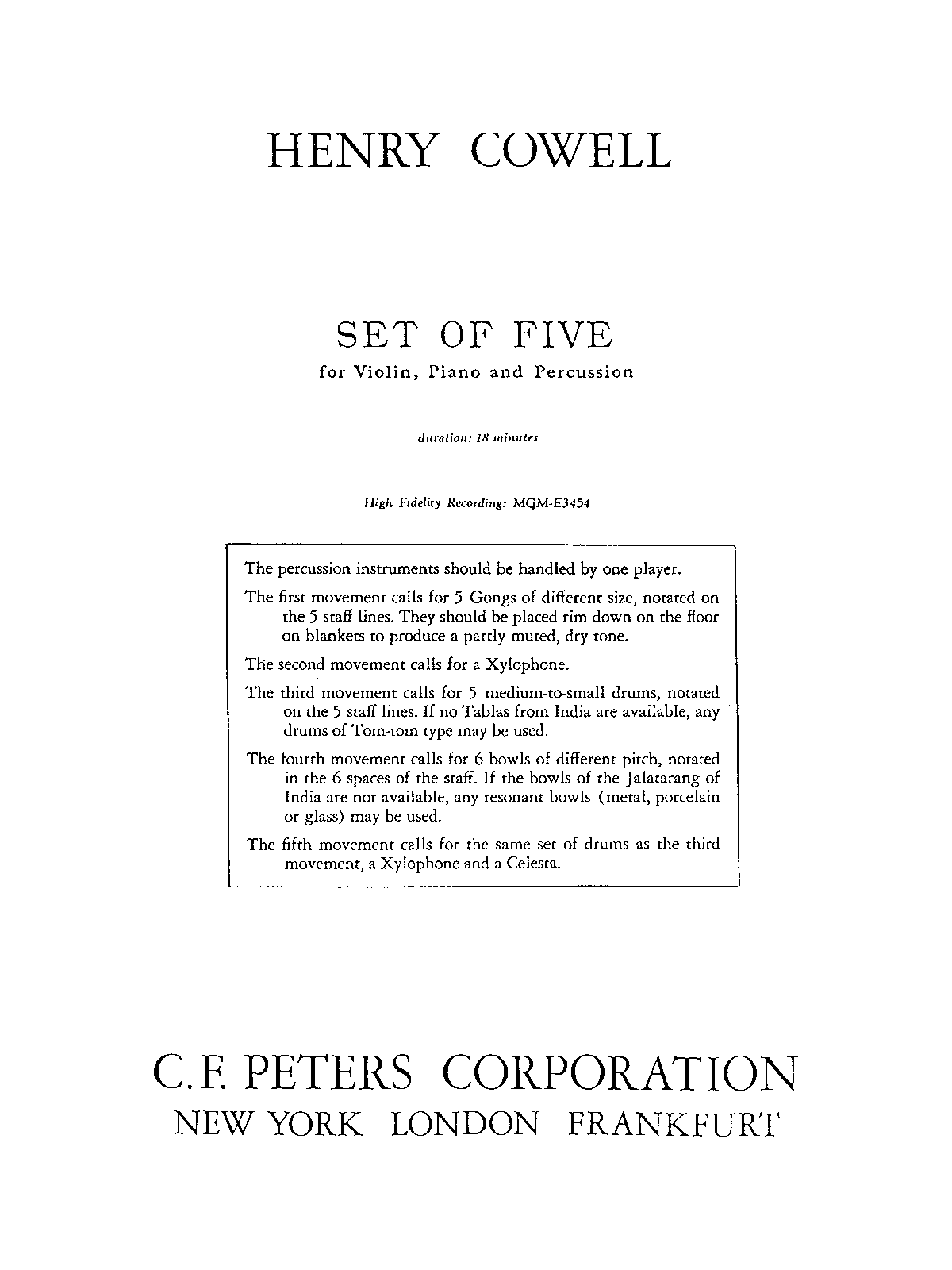| Copyright Information | First registered for US copyright as an unpublished work in 1957 (EU472726). Another copy of the full score was later deposited in 1967 before publication in 1968. Despite the c1968 notice on the first published copy, the copyright on this piece expired due to the 1957 copyright not being renewed, although the separate US copyright on the introduction (by Edward Cole) included in the 1968 edition has not expired. In the USA this work is most likely in the public domain because no renewal was found after a thorough search of the Catalog of Copyright Entries and it was ineligible for "restoration" under GATT/TRIPS. |