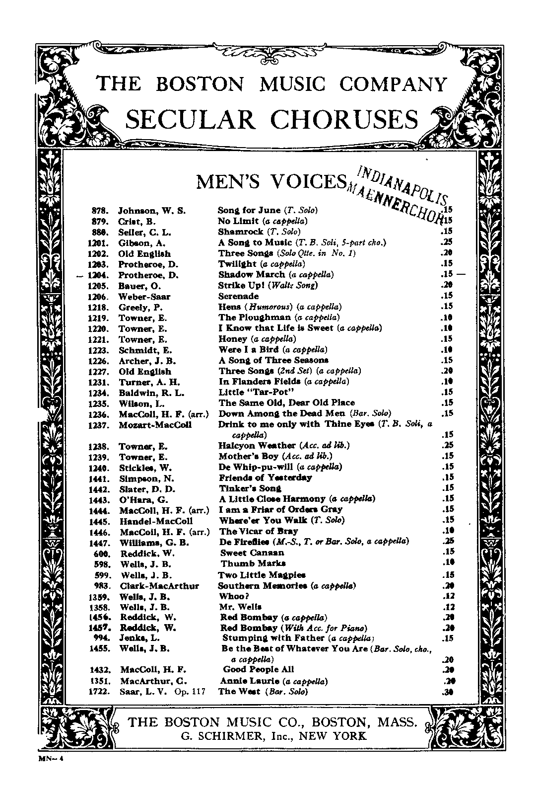 | Genre Categories | Marches; Songs; For male chorus; |